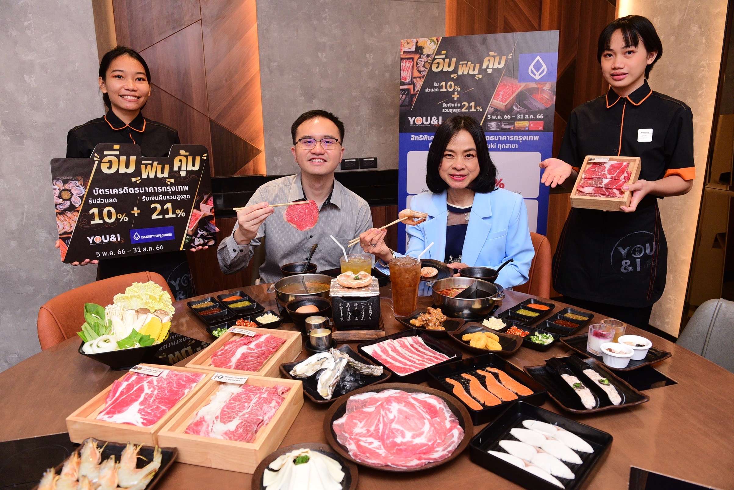 ยู แอนด์ ไอ กรุ๊ป จำกัด จัดแคมเปญ “อิ่ม ฟิน คุ้ม” เอาใจสายบุฟเฟต์ มอบสิทธิพิเศษ 3 ต่อ สำหรับผู้ถือบัตรเครดิตธนาคารกรุงเทพ เมื่อใช้จ่ายที่ร้าน You & I Premium Suki สิทธิพิเศษ 1 รับส่วนลด 10% เมื่อทานบุฟเฟต์ 3 ท่านขึ้นไป/เซลส์สลิป สิทธิพิเศษ 2 รับเครดิตเงินคืน 15% เมื่อแลกใช้คะแนนสะสมเท่ายอดใช้จ่ายต่อเซลส์สลิปโดยไม่จำกัดยอดขั้นต่ำ และ สิทธิพิเศษ 3 รับเครดิตเงินคืน 300 บาท เมื่อมียอดใช้จ่ายสะสมตั้งแต่ 2 ครั้งขึ้นไป รวมยอดครบทุก 5,000 บาท หรือเทียบเท่า 6% (จำกัดยอดเครดิตเงินคืนสิทธิพิเศษ 3 รวมสูงสุด 600 บาท/ท่าน/ตลอดรายการ)