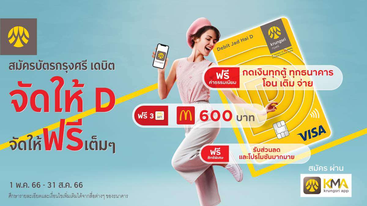 กรุงศรี (ธนาคารกรุงศรีอยุธยา จำกัด (มหาชน)) จัดให้ฟรีเต็มๆ เมื่อสมัครบัตรกรุงศรี เดบิต จัดให้ D ผ่านทาง KMA krungsri app ระหว่างวันที่ 1 พฤษภาคม 2566 – 31 สิงหาคม 2566 รับสิทธิ์ฟรีถึง 3 ต่อ