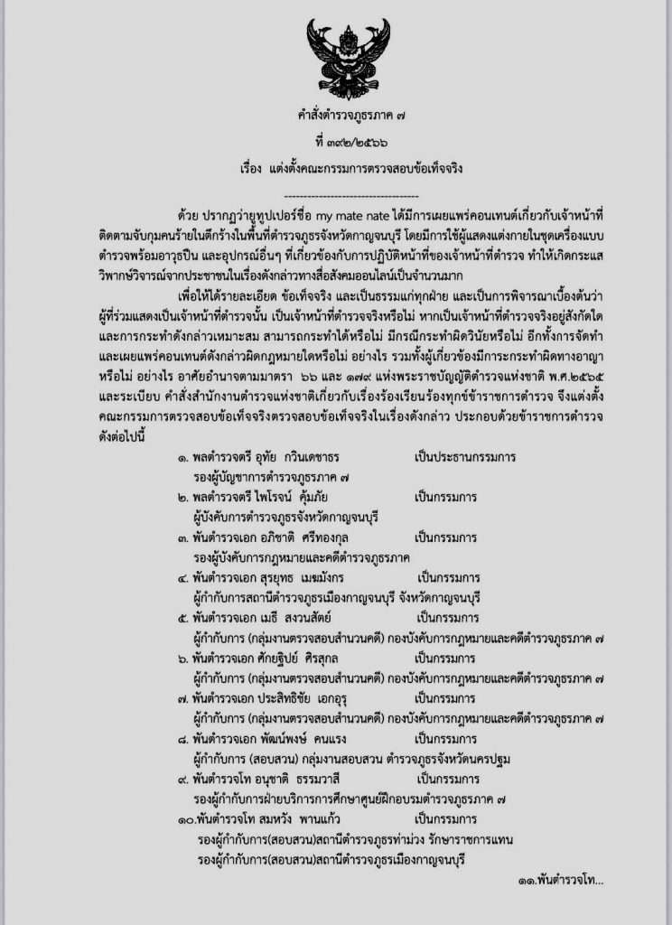 เมื่อวันที่ 19 มิถุนายน พ.ศ.2566 พล.ต.ท.ธนายุตม์ วุฒิจรัสธำรงค์ ผบช.ภ.7 ได้มีคำสั่งที่ 392 /2566 เรื่อง แต่งตั้งคณะกรรมการตรวจสอบข้อเท็จจริง ด้วย ปรากฎว่ายูทูปเปอร์ชื่อ my mate nate ได้มีการเผยแพร่คอนเทนต์เกี่ยวกับเจ้าหน้าที่ติดตามจับกุมคนร้ายในตึกร้างในพื้นที่ตำรวจภูธรจังหวัดกาญจนบุรี โดยมีการใช้ผู้แสดงแต่งกายในชุดเครื่องแบบตำรวจพร้อมอาวุธปืน และอุปกรณ์อื่นๆ ที่เกี่ยวข้องกับการปฏิบัติหน้าที่ของเจ้าหน้าที่ตำรวจ ทำให้เกิดกระแสวิพากษ์วิจารณ์จากประชาชนในเรื่องดังกล่าวทางสื่อสังคมออนไลน์เป็นจำนวนมาก