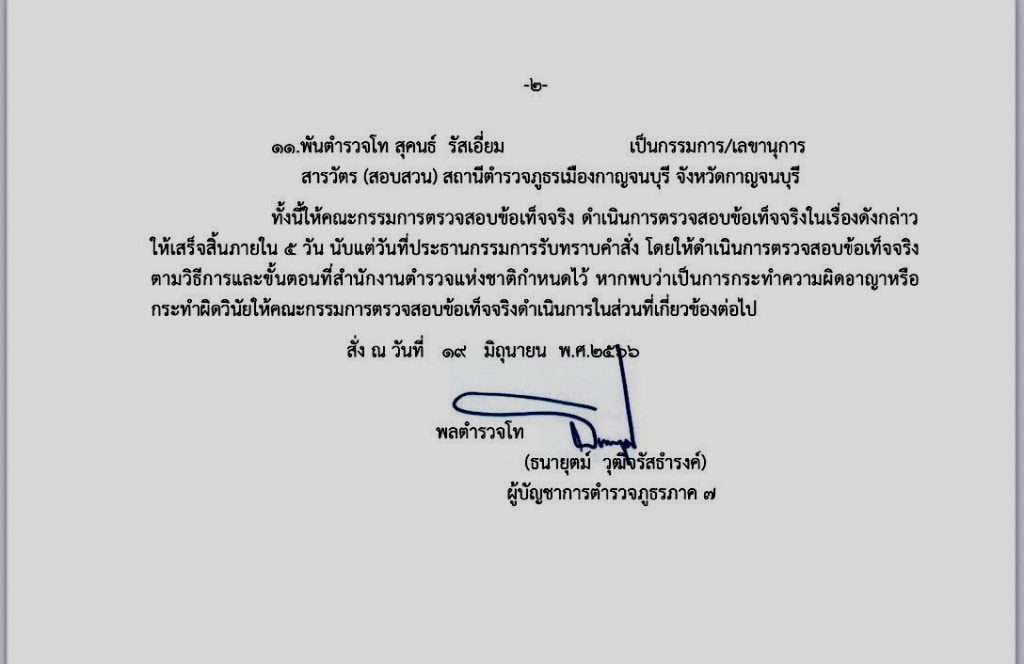 ทั้งนี้ ให้คณะกรรมการตรวจสอบข้อเท็จจริง ดำเนินการตรวจสอบข้อเท็จจริงในเรื่องดังกล่าวให้เสร็จสิ้นภายใน 5 วัน นับแต่วันที่ประธานกรรมการรับทราบคำสั่ง โดยให้ดำเนินการตรวจสอบข้อเท็จจริงตามวิธีการและขั้นตอนที่สำนักงานตำรวจแห่งชาติกำหนดไว้ หากพบว่าเป็นการกระทำความผิดอาญาหรือกระทำผิดวินัยให้คณะกรรมการตรวจสอบข้อเท็จจริงดำเนินการในส่วนที่เกี่ยวข้องต่อไป “คำสั่งดังกล่าวระบุ “