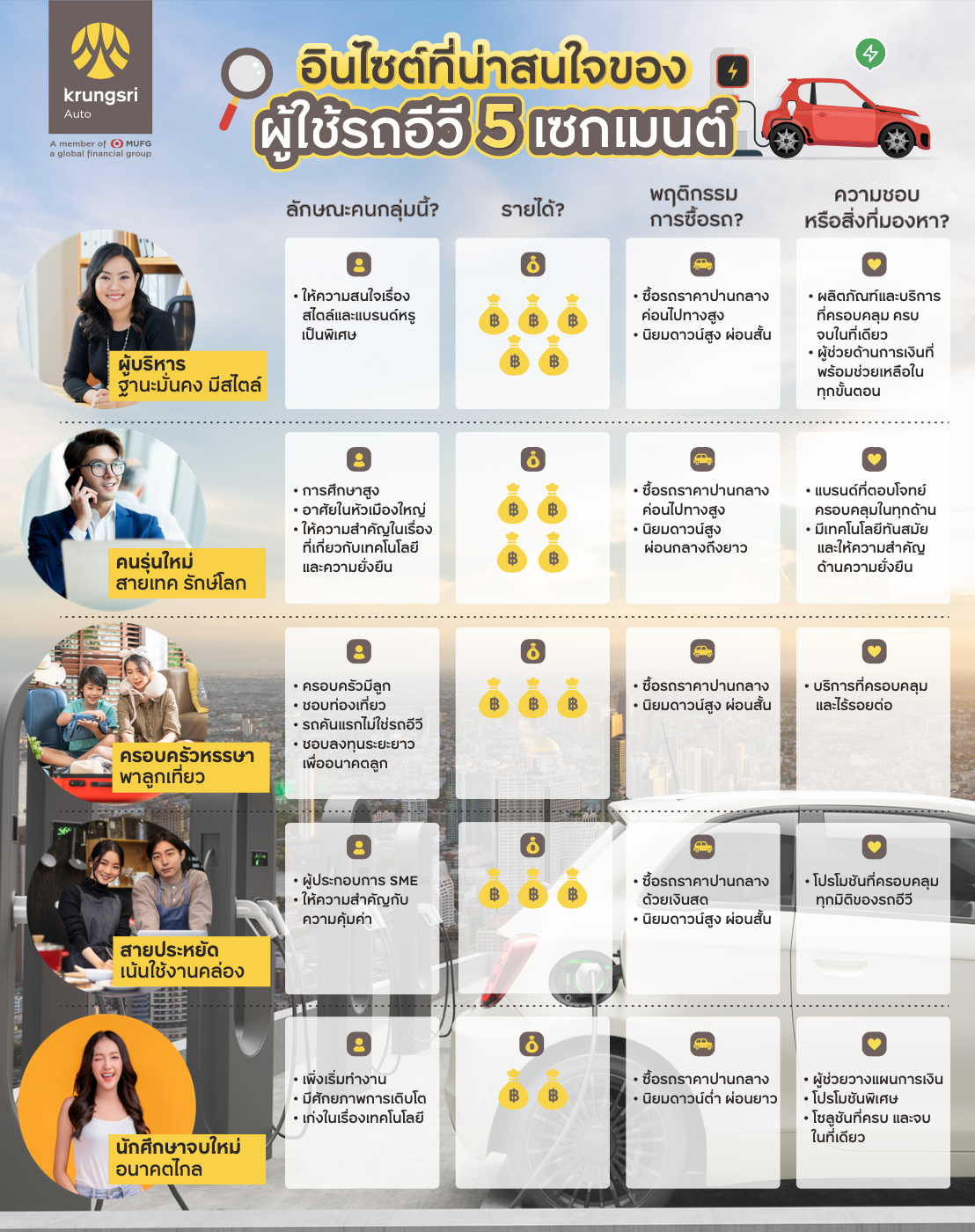 โดยอินไซต์ผู้ใช้รถอีวี 5 เซกเมนต์ ที่ กรุงศรี ออโต้ ได้เก็บรวบรวมจากพฤติกรรมการใช้บริการสินเชื่อยานยนต์ไฟฟ้า ประกอบไปด้วย: