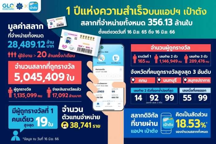 ทั้งนี้ ตั้งแต่งวดวันที่ 16 มิถุนายน 2565 จนถึงงวดวันที่ 16 มิถุนายน 2566 มีผู้ถูกรางวัลสลากดิจิทัลรวมทั้งสิ้น 1,135,099 ราย และมีสลากที่ถูกรางวัลแล้วรวม 5,045,409 ใบ คิดเป็นเงินรางวัลกว่า 17,000 ล้านบาท และมีผู้ถูกรางวัลที่ 1 รวมทั้งสิ้น 165 ราย โดยในงวดวันที่ 16 เมษายน 2566 มีผู้ซื้อสลากดิจิทัลผ่านแอปฯ เป๋าตัง ถูกรางวัลที่ 1 รายเดียวสูงสุดจำนวน 19 ใบ ได้รับเงินรางวัล 114,000,000 บาท ตลอดระยะเวลา 1 ปีของการซื้อ-ขาย “สลากดิจิทัล” ผ่านแอปพลิเคชัน “เป๋าตัง” มีผู้ซื้อสลากดิจิทัลรวมกว่า 5.8 ล้านราย มีสลากดิจิทัลที่จำหน่ายไปแล้วรวมทั้งสิ้น 356 ล้านใบ คิดเป็นมูลค่ากว่า 28,000 ล้านบาท เป็นของผู้ค้าสลากรายย่อยจากทั่วประเทศกว่า 38,000 ราย ซึ่งสามารถเข้าถึงกลุ่มผู้ใช้งานแอปฯ เป๋าตัง ที่ปัจจุบันมีจำนวนกว่า 40 ล้านราย และจำหน่ายสลากหมดก่อนถึงวันออกรางวัลทุกงวด คาดว่าปีนี้ จะมีสลากดิจิทัลจำหน่ายบนแอปฯ เป๋าตังไม่น้อยกว่า 25 ล้านใบต่องวด จากปัจจุบัน 18.6 ล้านใบต่องวด โดยจะพิจารณาให้สอดคล้องกับความต้องการที่แท้จริงของประชาชน