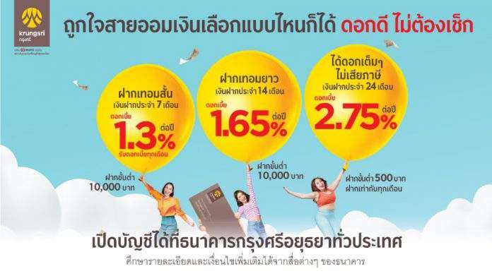กรุงศรี (ธนาคารกรุงศรีอยุธยา จำกัด (มหาชน)) จัดแคมเปญเงินฝาก เอาใจสายออม เลือกแบบไหนก็ได้ ดอกดี ไม่ต้องเช็ก เมื่อเปิดบัญชีเงินฝากประจำที่ธนาคารกรุงศรีอยุธยา ทั่วประเทศ (เงื่อนไขการฝากเงินและอัตราดอกเบี้ยตามประกาศของธนาคารที่ใช้บังคับอยู่ ณ วันที่ต่ออายุการฝากนั้น)