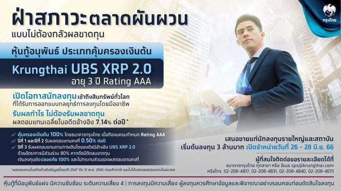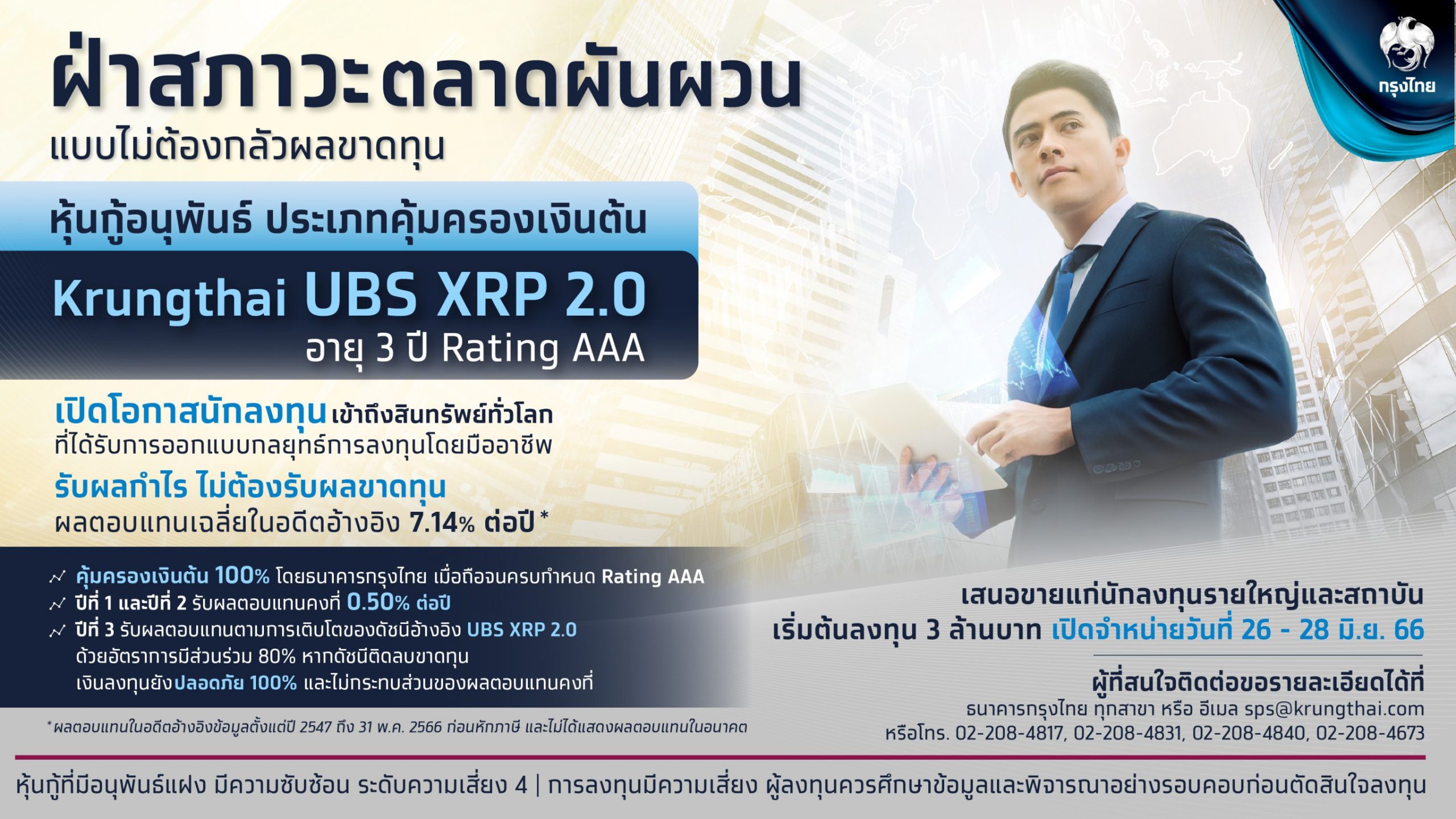 ธนาคารกรุงไทย เตรียมเสนอขายหุ้นกู้อนุพันธ์ชุดใหม่ “Krungthai UBS XRP 2.0” จ่ายผลตอบแทนอ้างอิงดัชนี UBS XRP 2.0 ที่กระจายการลงทุนใน 3 สินทรัพย์หลากหลายทั่วโลก “หุ้น-อัตราดอกเบี้ย-สินค้าโภคภัณฑ์” เปิดโอกาสสร้างผลตอบแทนในทุกสภาวะตลาด คงจุดเด่นคุ้มครองเงินต้น 100% เสนอขาย 26-28 มิถุนายนนี้