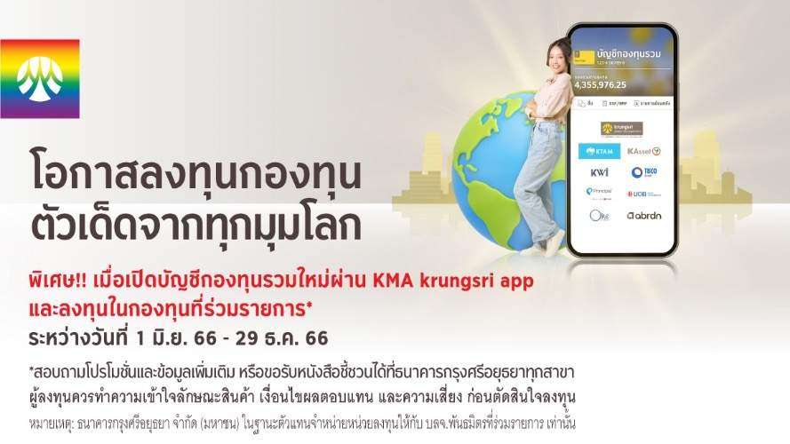กรุงศรี (ธนาคารกรุงศรีอยุธยา จำกัด (มหาชน)) คัดกองทุนตัวเด็ดที่ลงทุนในสินทรัพย์คุณภาพทั่วโลกจากหลาย บลจ. ชั้นนำ เพื่อโอกาสผลตอบแทนที่ดีในระยะยาว พร้อมจัดแคมเปญพิเศษให้กับลูกค้าใหม่ รับเงินคืน (Cash Back) 0.2% ของยอดเงินลงทุนสะสม (สูงสุด 1,000 บาทต่อคน) เมื่อเปิดบัญชีกองทุนรวม ผ่าน KMA krungsri app และมียอดเงินลงทุนสะสมในกองทุนรวมที่ร่วมรายการ ผ่านธนาคารกรุงศรีอยุธยา ในระหว่างวันที่ 1 มิ.ย. 66 – 29 ธ.ค. 66 ตั้งแต่ 1,000 บาทขึ้นไป โดยจะต้องคงสถานะบัญชีเงินฝากของธนาคารกรุงศรีอยุธยาที่เป็นบัญชีรับเงินค่าขายคืนที่ผูกไว้กับบัญชีกองทุน บัญชีกองทุน และ KMA krungsri app เป็นปกติ ณ วันที่ธนาคารโอนเงินคืน