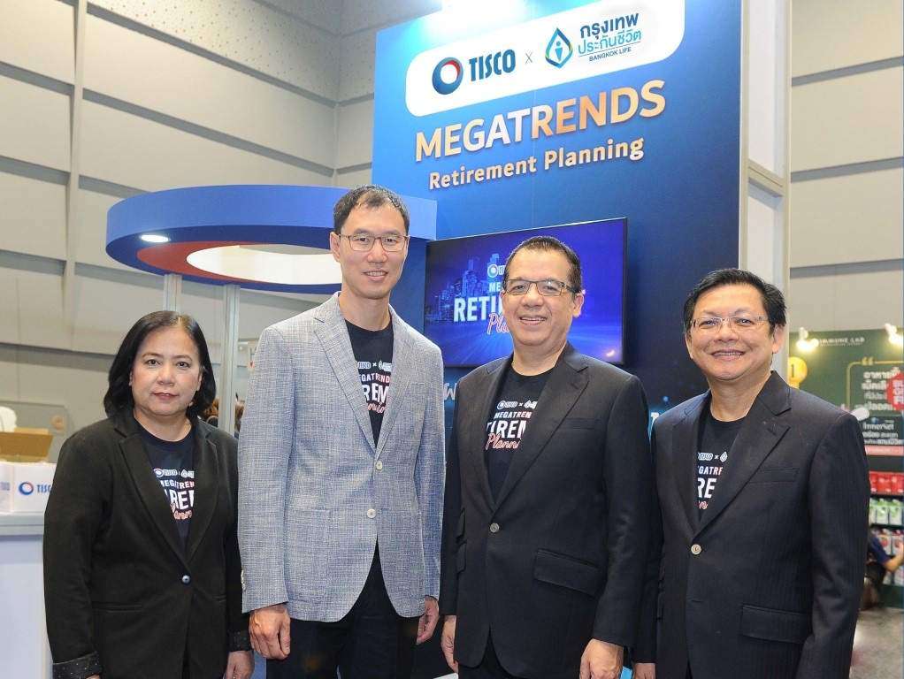 บริษัท กรุงเทพประกันชีวิต จำกัด (มหาชน) ร่วมกับ ธนาคารทิสโก้ จำกัด (มหาชน) (TISCO) เดินหน้าสร้างความมั่นคงทางการเงินให้คนไทย ในงานมหกรรมสุขภาพยิ่งใหญ่สุดในประเทศ Thailand Healthcare 2023 “เกษียณสโมสร” นำโดย นายโชน โสภณพนิช กรรมการผู้จัดการใหญ่และประธานเจ้าหน้าที่บริหาร บริษัท กรุงเทพประกันชีวิต จำกัด (มหาชน) (ที่สองจากซ้าย) และ นายพิชา รัตนธรรม ผู้ช่วยกรรมการผู้จัดการใหญ่อาวุโส ธนาคารทิสโก้ จำกัด (มหาชน) (ที่สามจากซ้าย) พร้อมด้วยคณะผู้บริหารจากสององค์กรพันธมิตร ร่วมเปิดบูทแนะนำการวางแผนเกษียณ ที่เท่าทันต่อการเปลี่ยนแปลงของโลก (Megatrends Retirement Planning) ครอบคลุมทั้งในมิติการเสริมสร้างความรู้ การลงทุนในธุรกิจแห่งอนาคต และปกป้องความเสี่ยงหลังเกษียณ ด้วยประกันบำนาญที่มีผลประโยชน์ในขณะดำรงชีวิต (Living Benefit) สูง ประกันสุขภาพแบบเหมาจ่าย และประกันโรคร้ายแรงที่มีทุนประกันสูง ให้คนไทยได้เตรียมสุขภาพการเงินที่พร้อมตอบโจทย์ไลฟ์สไตล์การใช้ชีวิต และการเกษียณอย่างแท้จริง