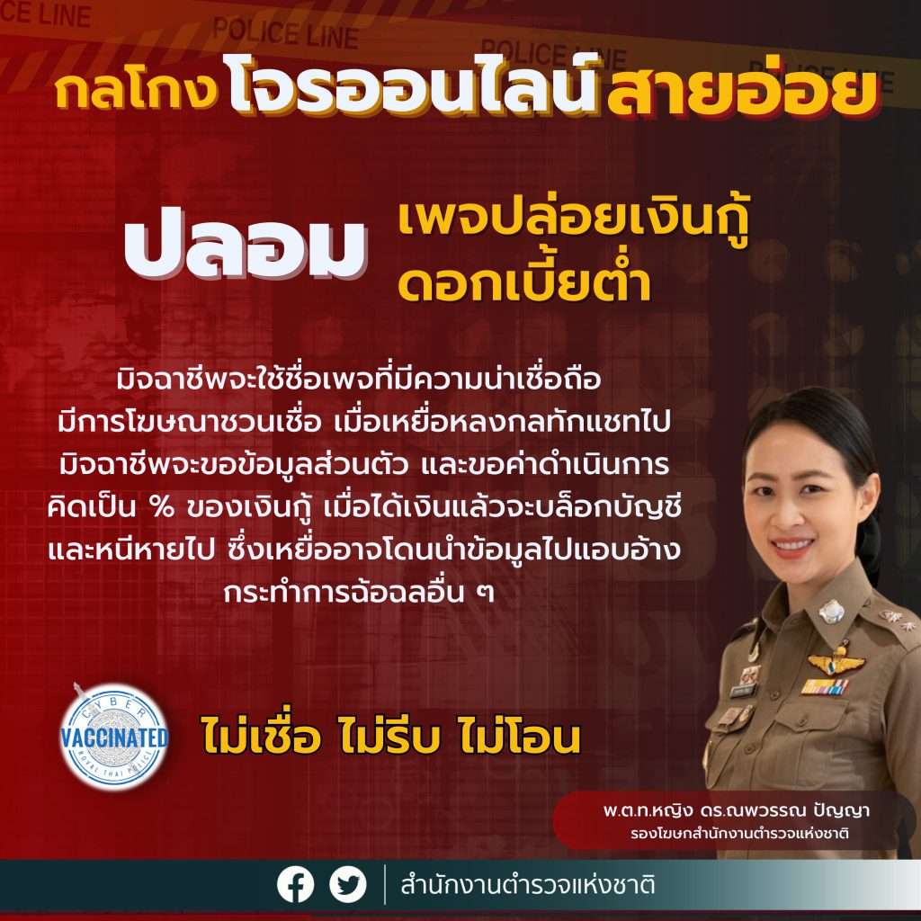 สำนักงานตำรวจแห่งชาติ โดย พล.ต.อ.ดํารงศักดิ์ กิตติประภัสร์ ผบ.ตร. มีความห่วงใยประชาชน จึงได้จัดทำแบบทดสอบ Cyber Vaccine (ตาม QR Code ที่แนบมาพร้อมนี้) เพื่อเป็นการเสริมสร้างภูมิคุ้มกันไซเบอร์ให้กับประชาชน ขอให้ประชาชนต้องมีสติ “ไม่เชื่อ ไม่รีบ ไม่โอน” เพื่อไม่ตกเป็นเหยื่อของโจรออนไลน์ ทั้งนี้สามารถติดตามรูปแบบการประชาสัมพันธ์กลโกงได้ที่เพจเฟซบุ๊ก “เตือนภัยออนไลน์” ปรึกษา-ขอคำแนะนำได้ที่ สายด่วน บช.สอท. 1441 หรือ ศูนย์ PCT 081-866-3000 โดยผู้เสียหายสามารถติดต่อธนาคารของตนเองเพื่อทำการระงับบัญชี โดยธนาคารจะออก Bank ID ผ่าน sms และขอให้ผู้เสียหายไปแจ้งความกับตำรวจที่ใดก็ได้โดยเร็ว โดยไม่ต้องคำนึงถึงท้องที่เกิดเหตุภายใน 72 ชั่วโมง หรือแจ้งความผ่านระบบออนไลน์ได้ที่เว็บไซต์ www.thaipoliceonline.com
