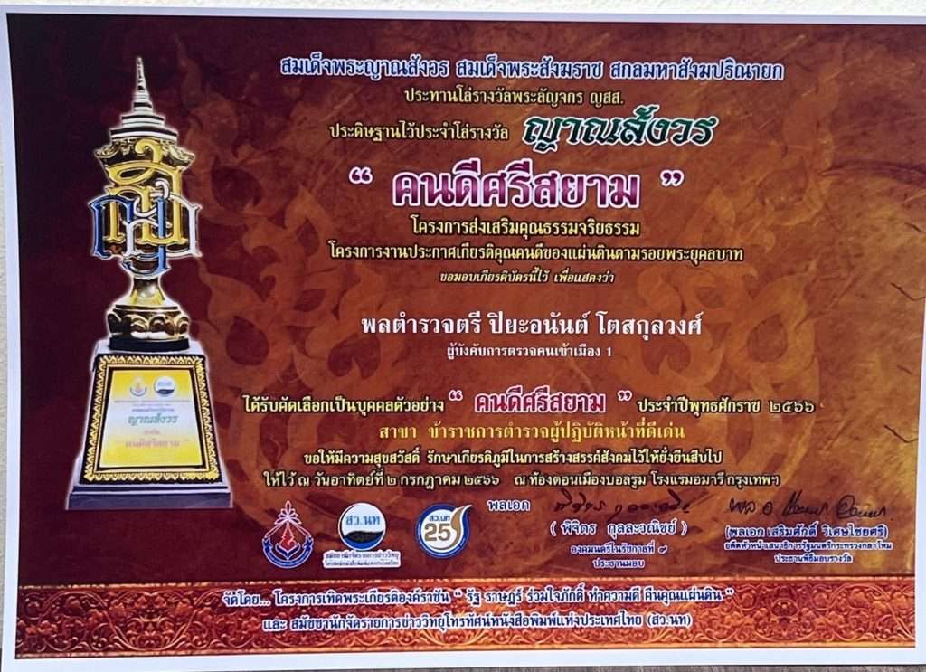 พล.ต.ต.ปิยะอนันต์ โตสกุลวงศ์ ผบก.ตม.1 เข้ารับมอบประทานรางวัล เกียรติคุณ “คนดีศรีแผ่นดิน” (รางวัล ญาณสังวร) สาขา ข้าราชการตำรวจผู้ปฏิบัติหน้าที่ดีเด่น ครั้งที่ 12 ประจำปี 2566 จากท่านประธานพิธีประทานรางวัล พลเอก เสริมศักดิ์ วิเศษไชยศรี อดีตหัวหน้าฝ่ายเสนาธิการ รัฐมนตรีกระทรวงกลาโหม นายกสมาคมนักธุรกิจอาเซียน