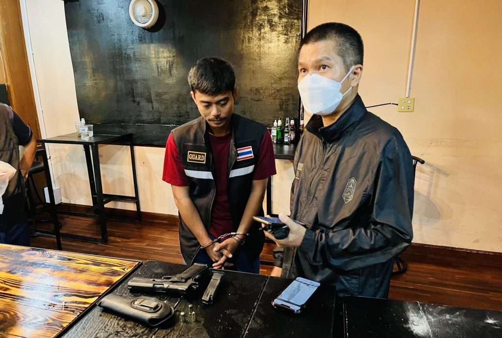 2.นายคฑาวุฒิ เขียวธง อายุ 29 ปี 63/5 ต.หนองแก อ.หัวหิน จ.ประจวบคีรีขันธ์ ซึ่งเป็นพนักงานรักษาความปลอดภัย ของ ร้านบ้านใหญ่ ในความผิดฐาน “มีอาวุธปืนไว้ในความครอบครองโดยไม่ได้รับอนุญาต และพกพาอาวุธปืนไปในเมือง หมู่บ้าน ทางสาธารณะโดยปราศจากความจำเป็นเร่งด่วน” พร้อมด้วยอาวุธปืน ไทยประดิษฐ์ ขนาด .380 จำนวน 1 กระบอก ซองบรรจุกระสุน จำนวน 1 ชิ้น กระสุนปืนขนาด .380 จำนวน 3 นัด ซองพก 1 ชิ้น