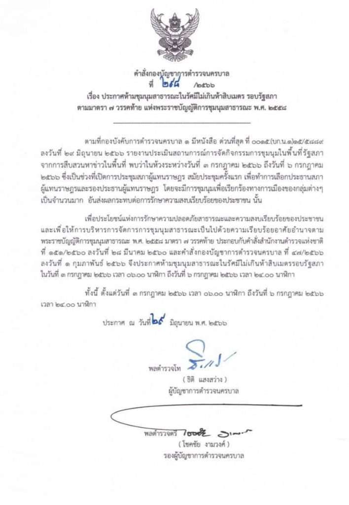 เพื่อประโยชน์แห่งการรักษาความปลอดภัยสาธารณะและความสงบเรียบร้อยของประชาชนและเพื่อให้การบริหารการจัดการการชุมนุมสาธารณะเป็นไปด้วยความเรียบร้อยอาศัยอำนาจตามพระราชบัญญัติการชุมนุมสาธารณะ พ.ศ. ๒๕๕๘ มาตรา ๗ รรคท้าย ประกอบกับคำสั่งสำนักงานตำรวจแห่งชาติ จึงประกาศห้ามชุมนุมสาธารณะในรัศมีไม่เกินห้าสิบเมตรรอบรัฐสภา ในวันที่ 3กรกฏาคม 2566 เวลา 06.00น.- วันที่ 6 กรกฎาคม 2566 เวลา 24.00น.