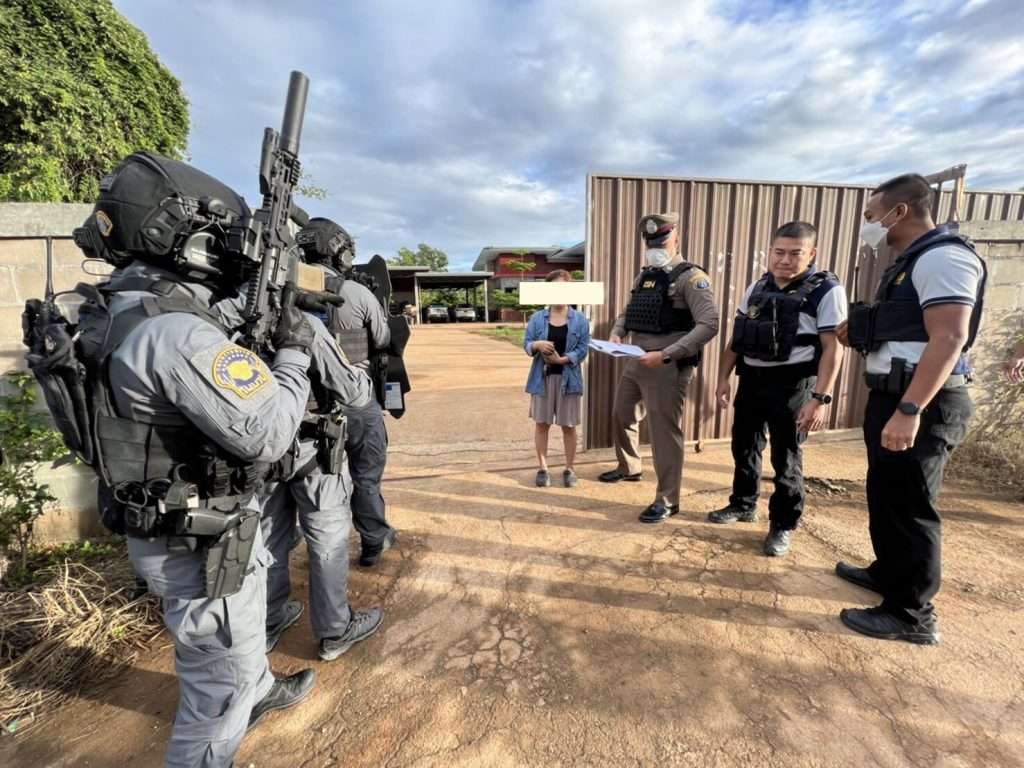 โดยเป้าหมายสำคัญจุดแรกอยู่ที่บ้านเลขที่ 517 ม.6 ต.มหาวัน อ.แม่สอด จ.ตาก บ้านพักของ นางรัตนาภรณ์ หรือ เจ๊รัตน์ แม่สอด ผู้ต้องหาตามหมายจับศาลอาญา ข้อหา “ร่วมกันฉ้อโกงและร่วมกันเป็นอั้งยี่ซ่องโจร” หลังพบหลักฐานความเชื่อมโยงว่าเป็นนายทุนว่าจ้างให้ชาวบ้านที่เดือดร้อนเงินไปติดต่อหลอกดาวน์รถยนต์ป้ายแดงตามศูนย์รถยนต์ต่างๆ ก่อนเชิดส่งขายข้ามไปยังฝั่งประเทศเมียนมาร์ ซึ่งทันทีที่เจ้าหน้าที่ไปถึงพบบ้านหลังดังกล่าวเป็นบ้านเดี่ยวตั้งอยู่ในพื้นที่ขนาดใหญ่ มีรั้วรอบขอบชิด เจ้าหน้าที่จึงส่งสัญญาณเรียกให้เจ้าตัวเดินออกมาบริเวณหน้าบ้านก่อนแสดงหมายจับให้รับทราบ จากนั้นจึงคุมตัวพาเข้าตรวจค้นภายในบ้านพัก ซึ่งขณะนี้อยู่ระหว่างดำเนินการ