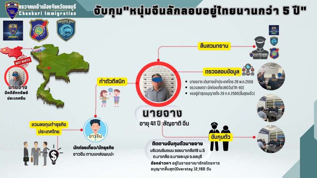 คดีที่ 5. ตม.จว.ชลบุรี สนธิกําลังร่วมกับ สืบสวน ตม.3 จับกุม “หนุ่มจีนลักลอบอยู่ไทยนานกว่า 5 ปี”