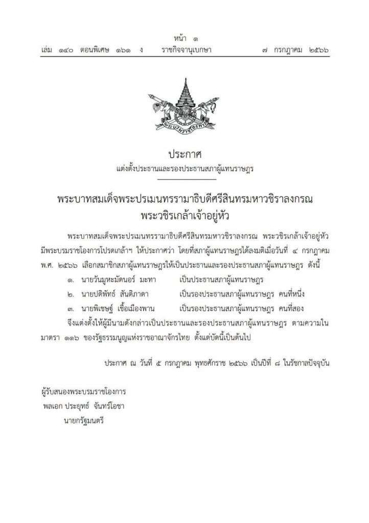 พระบาทสมเด็จพระปรเมนทรรามาธิบดีศรีสินทรมหาวชิราลงกรณ พระวชิรเกล้าเจ้าอยู่หัวมีพระบรมราชโองการโปรดเกล้าฯ ให้ประกาศว่า โดยที่สภาผู้แทนราษฎรได้ลงมติเมื่อวันที่ ๔ กรกฎาคม พ.ศ.๒๕๖๖ เลือกสมาชิกสภาผู้แทนราษฎรให้เป็นประธานและรองประธานสภาผู้แทนราษฎร ดังนี้