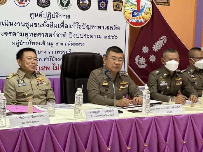 วันนี้ (8 ก.ค.66) เวลา 09.30 น. พล.ต.อ.ดำรงศักดิ์ กิตติประภัสร์ ผบ.ตร. เดินทางมาตรวจเยี่ยมโครงการดำเนินงานชุมชนยั่งยืนเพื่อแก้ไขปัญหายาเสพติดแบบครบวงจร ตามยุทธศาสตร์ชาติ ในพื้นที่บ้านโพรงเข้ อ.ท่ายาง จว.เพชรบุรี โดยมี นายณัฐชัย นำพูนสุขสันต์ ผู้ว่าราชการจังหวัดเพชรบุรี ,พล.ต.ท.ธนายุตม์ วุฒิตรัสธำรงค์ ผบช.ภ.7 ,พล.ต.ท.นพดล ศรสำราญ ผู้ทรงคุณวุฒิพิเศษ ตร. ,พล.ต.ท.วรายุทธ สุขวัฒน์ ผู้ทรงคุณวุฒิพิเศษ ตร. ,พล.ต.ท.คีรีศักดิ์ ตันตินวะชัย ผบช.ประจำ สง.ผบ.ตร. ,นายทัศน์พงษ์ วัฒนายากร ผอ.ปปส.ภ.7 ,นายบุญลาภ ทิพย์จันทร์ ผู้แทน สสจ.เพชรบุรี ,พล.ต.ต.วัฒนา ยี่จีน รอง ผบช.ภ.7 ,พล.ต.ต.พลัฏฐ์ วิเศษสิงห์ ผบก.สกัดกั้น 1 บช.ปส. ,พล.ต.ต.ปิติ นฤขัตรพิชัย ผบก.ภ.จว.เพชรบุรี , พ.อ.กรกานต์ นาเวชวณิชกุล รอง ผบ.มทบ.15 , เจ้าหน้าที่ที่เกี่ยวข้อง และผู้ใหญ่บ้าน ผู้นำท้องถิ่น ชุมชน เข้าร่วม ณ บ้านโพรงเข้ อ.ท่ายาง จว.เพชรบุรี