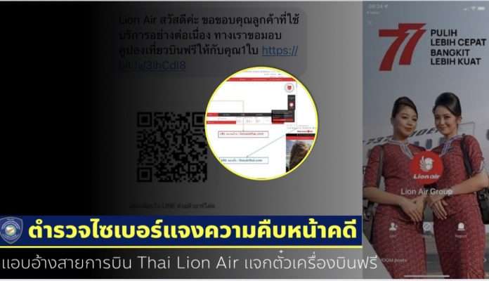 ตำรวจไซเบอร์ ชี้แจงความคืบหน้าคดี แอบอ้างเป็นเจ้าหน้าที่สายการบิน ไทยไลอ้อนแอร์ (Thai Lion Air)แจกตั๋วเครื่องบินฟรีในฤดูกาลท่องเที่ยว พบเหยื่อกว่า 100 ราย ความเสียหายกว่า 150 ล้านบาท พร้อมแนะแนวทางป้องกัน