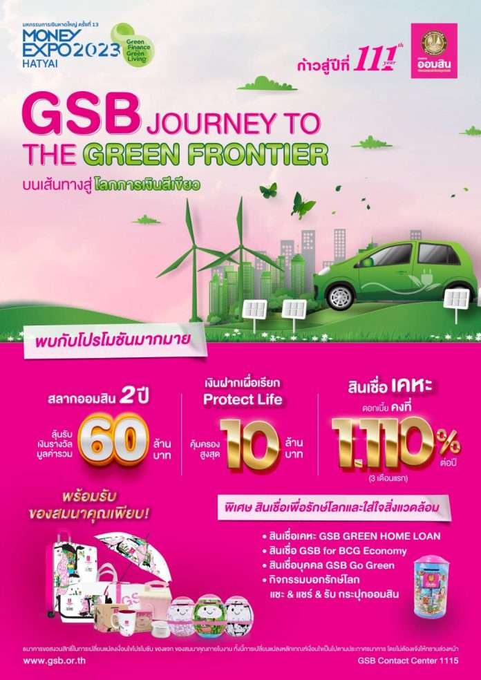 มหกรรมการเงินหาดใหญ่ ธนาคารออมสินจัดบูธภายใต้แนวคิด “GSB Journey to The Green Frontier : บนเส้นทางสู่โลกการเงินสีเขียว” สอดคล้องตามยุทธศาสตร์ธนาคารเพื่อสังคมที่มุ่งเน้นดำเนินการตามกรอบ ESG โดยให้ความสำคัญตั้งแต่กระบวนการจัดทำบูธที่เลือกใช้วัสดุที่เป็นมิตรต่อสิ่งแวดล้อม การออกแบบผลิตภัณฑ์และบริการที่เน้นสร้างผลกระทบเชิงบวกต่อสังคม รวมถึงมีกิจกรรมเชิญชวนดูแลสิ่งแวดล้อม จึงขอเชิญชวนพี่น้องประชาชนชาวหาดใหญ่และจังหวัดใกล้เคียง เยี่ยมชมบูธธนาคารออมสินในงานมหกรรมการเงินหาดใหญ่ ครั้งที่ 13 ได้ที่เซ็นทรัลหาดใหญ่ ระหว่างวันที่ 7-9 ก.ค. 2566