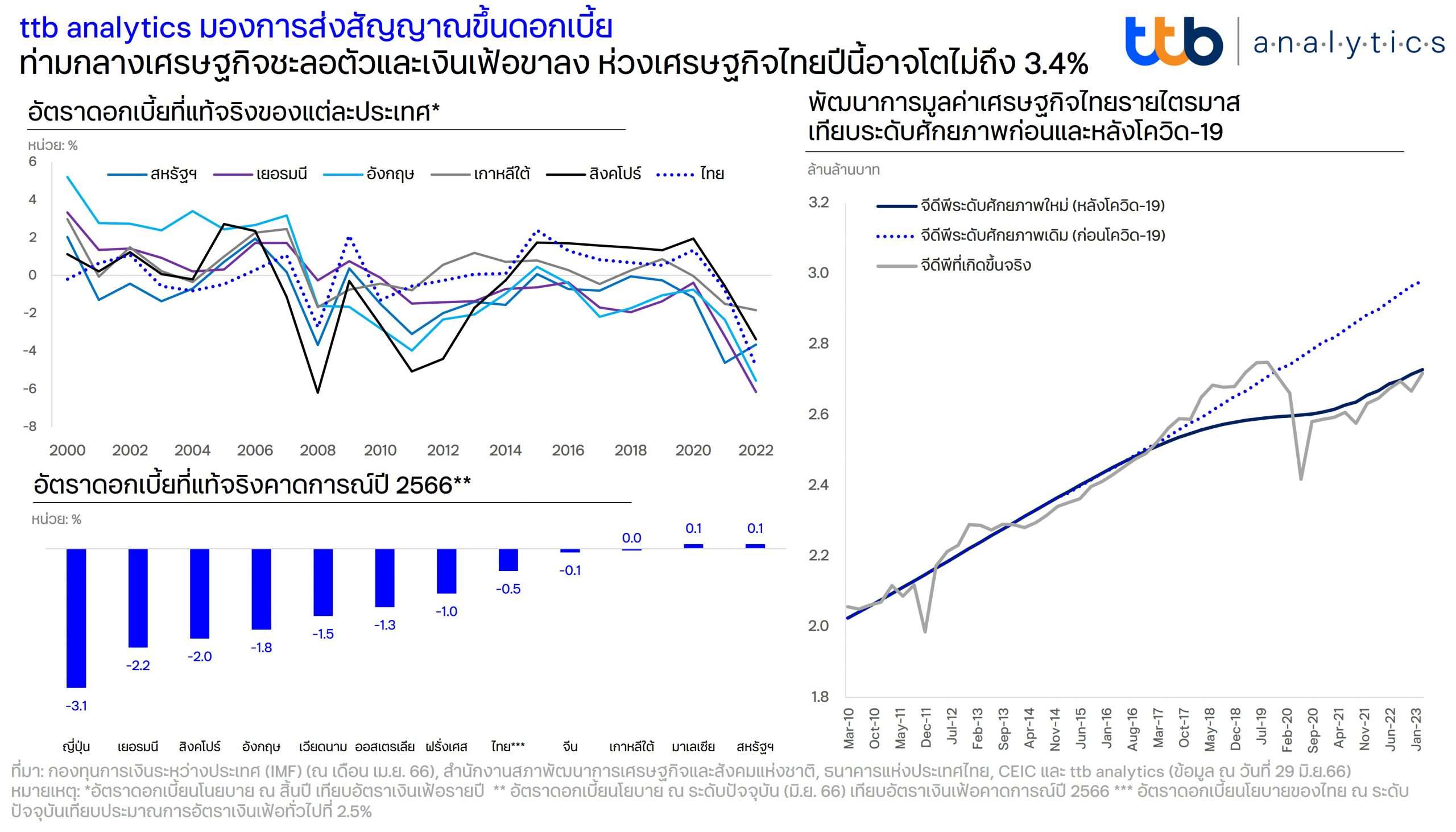 ttb analytics ประเมินว่า เงินเฟ้อไทยได้ผ่านจุดสูงสุดไปแล้วเมื่อช่วงปลายปีที่ผ่านมา และเริ่มลดลงต่อเนื่องจนเข้าสู่กรอบเป้าหมายได้ตั้งแต่ไตรมาสแรกของปี 2566 นี้ ซึ่งล่าสุดในเดือนมิถุนายนที่ผ่านมา อัตราเงินเฟ้อทั่วไปและเงินเฟ้อพื้นฐานก็ปรับลดลงมาอยู่ที่ 0.23% และ 1.32% ตามลำดับ ทั้งนี้ คาดว่าอัตราดอกเบี้ยที่แท้จริงของไทยในระยะต่อไปจะมีแนวโน้มเพิ่มขึ้นอย่างรวดเร็วจากเงินเฟ้อที่ปรับตัวลดลงมากในไตรมาสที่ 3 ตามผลของฐานสูงในปีก่อนหน้า (แม้มีแรงกดดันจากความเสี่ยงปรากฎการณ์เอลนีโญ) รวมไปถึงการผ่อนมาตรการดูแลค่าครองชีพของภาครัฐ และกิจกรรมทางเศรษฐกิจที่มีแนวโน้มชะลอตัวลงจากทั้งปัจจัยภายในและนอกประเทศ ทำให้มีการส่งสัญญาณขึ้นดอกเบี้ยอีกอย่างน้อย 0.25% ในปีนี้ ซึ่งอาจดึงให้เศรษฐกิจไทยทั้งปีมีแนวโน้มขยายตัวต่ำกว่าที่คาดไว้ก่อนหน้าที่ 3.4%