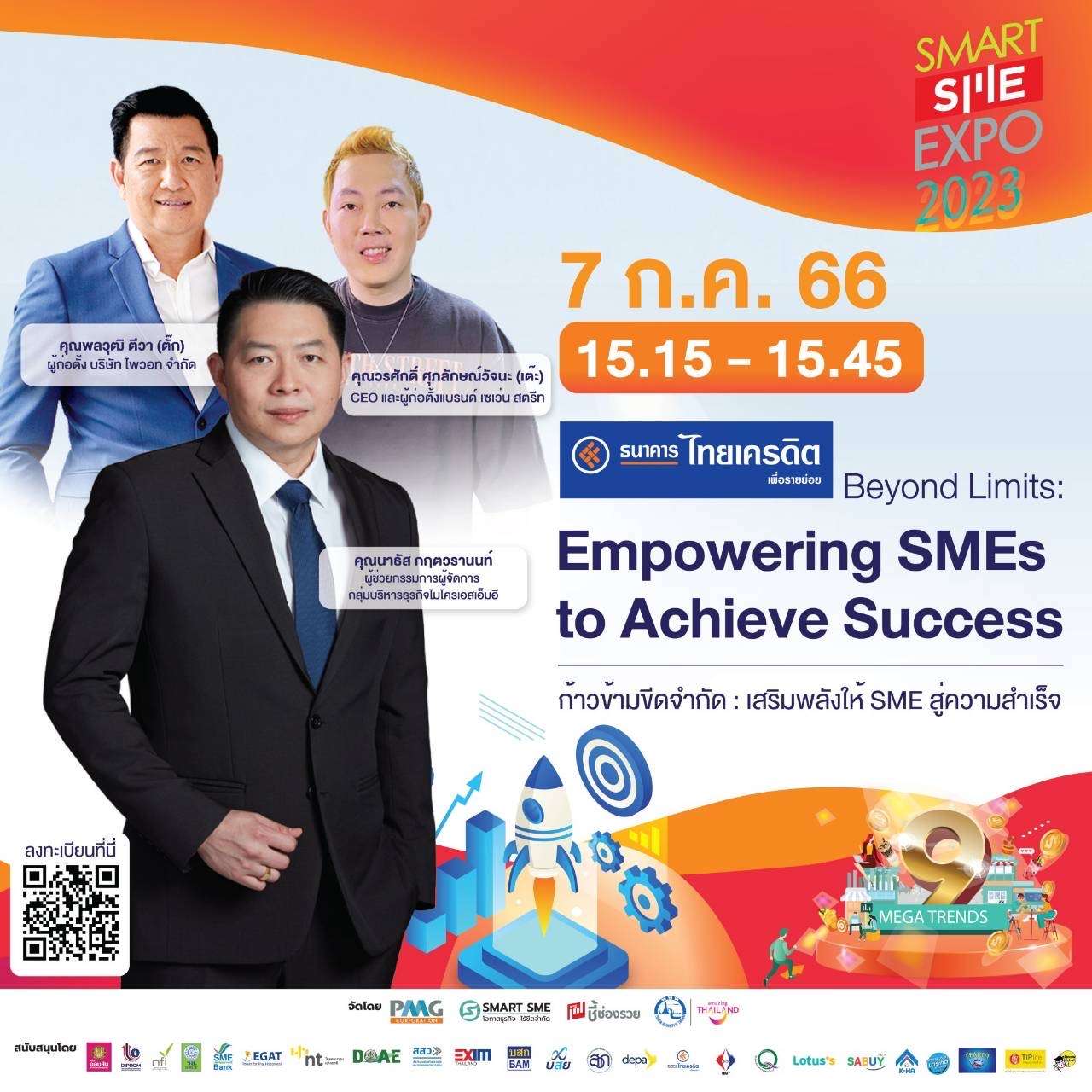 ธนาคารไทยเครดิต เพื่อรายย่อย จำกัด (มหาชน) มุ่งมั่นตามจุดยืน STANDBY เคียงข้างผู้ประกอบการไมโครเอสเอ็มอี (Micro SME) ยกทัพผลิตภัณฑ์สินเชื่อ SME กล้าให้ ร่วมออกบูธในงาน Smart SME Expo 2023 พร้อมจัดเจ้าหน้าที่บริการสินเชื่อ (RM) คอยให้คำปรึกษาด้านสินเชื่อสำหรับผู้ประกอบการอย่างใกล้ชิด รวมถึงกิจกรรมเสวนาจากผู้ประกอบการไมโครเอสเอ็มอีที่ประสบความสำเร็จที่เวทีกลาง และกิจกรรมพิเศษที่บูธธนาคารให้ร่วมสนุกตลอดงาน ระหว่างวันที่ 6-9 กรกฎาคม 2566 ณ ศูนย์แสดงสินค้าและการประชุมอิมแพค เมืองทองธานี ฮอลล์ 7-8 โดย นายธีระยุทธ วานิชชัง ผู้ช่วยรัฐมนตรีประจำกระทรวงอุตสาหกรรม นายวาที พีระวรานุพงศ์ รองอธิบดีกรมส่งเสริมอุตสาหกรรม นางสาวณรินณ์ทิพ วิริยะบัณฑิตกุล ประธานการจัดงาน และ นายนาธัส กฤตวรานนท์ ผู้ช่วยกรรมการผู้จัดการ กลุ่มบริหารธุรกิจไมโครเอสเอ็มอี ธนาคารไทยเครดิต เพื่อรายย่อย ให้เกียรติร่วมพิธีเปิดบูธอย่างเป็นทางการ
