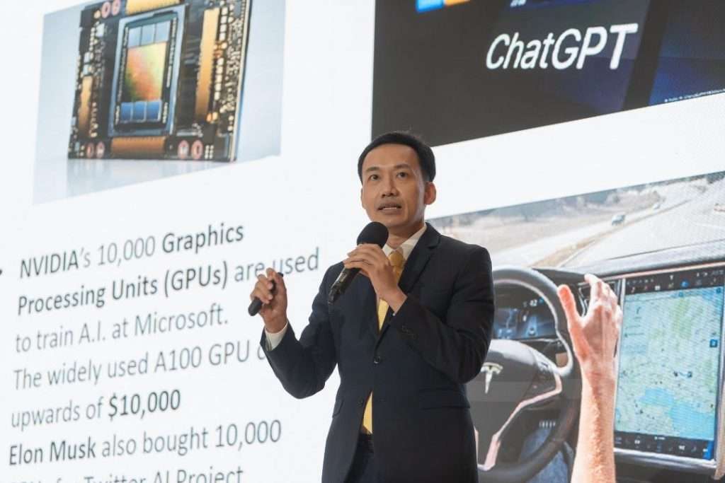 ด้านนายกรภัทร วรเชษฐ์ ผู้อำนวยการฝ่ายวิจัยและบริการการลงทุน บริษัทหลักทรัพย์ กรุงศรี พัฒนสิน จำกัด (มหาชน) ได้ให้ความเห็นในส่วนของหุ้นไทยกับบริบทการเติบโตของ AI ว่า สถานการณ์ตลาดในประเทศไทยยังอยู่ในช่วง Underperform หากเทียบกับตลาดอื่นๆ อย่างไรก็ตาม เมื่อตลาดหุ้นไทยปรับตัว ลง ถือเป็นโอกาสในการเพิ่มน้ำหนักการลงทุนหุ้นได้ สิ่งสำคัญ คือ การลงทุนในสินทรัพย์ปลอดภัย เลือกหุ้นที่มั่นคง และมีโอกาสที่ธุรกิจยังคงอยู่ต่อไปในอีก 3-5 ปี อาทิ กลุ่มปิโตรเคมี กลุ่มค้าปลีกที่เติบโตไปกับเศรษฐกิจฐานราก โรงไฟฟ้า นิคมอุตสาหกรรมและชิ้นส่วนอิเล็กทรอนิกส์ กลุ่มธนาคาร และกลุ่มโรงพยาบาล สำหรับหุ้นธีมหลักที่เกี่ยวข้องกับเรื่องเทคโนโลยี ได้แก่ 1) ธุรกิจต้นน้ำ ต้องยอมรับว่าประเทศไทย ไม่มีธุรกิจผู้ผลิตชิปโดยตรง อย่างไรก็ตาม แนะนำ HANA Microelectronics ซึ่งเป็นธุรกิจส่วนประกอบของชิปอิเล็กทรอนิกส์เพื่อใช้ในการประมวผลขั้นสูง มีส่วนสำคัญกับการเติบโตของเทรนด์ยานยนต์ไฟฟ้า และเทรนด์ของ AI 2) ธุรกิจขั้นกลาง เป็นตัวกลางในการจัดระบบและประมวลผลข้อมูลต่างๆ แนะนำ BE8 ที่ช่วยบริษัทต่างๆ ให้สามารถนำเทคโนโลยีอย่าง AI มาใช้กับธุรกิจได้จริง อาทิ ระบบ CRM Platform สำหรับใช้ในองค์กรใหญ่ 3) ธุรกิจขั้นปลาย ที่นำเอา AI ไปใช้ในธุรกิจสาขาต่างๆ อาทิ การแพทย์ การเงินการธนาคาร ธุรกิจสื่อ และธุรกิจค้าปลีก แนะนำ BDMS CPEXTRA ADVANC เป็นต้น