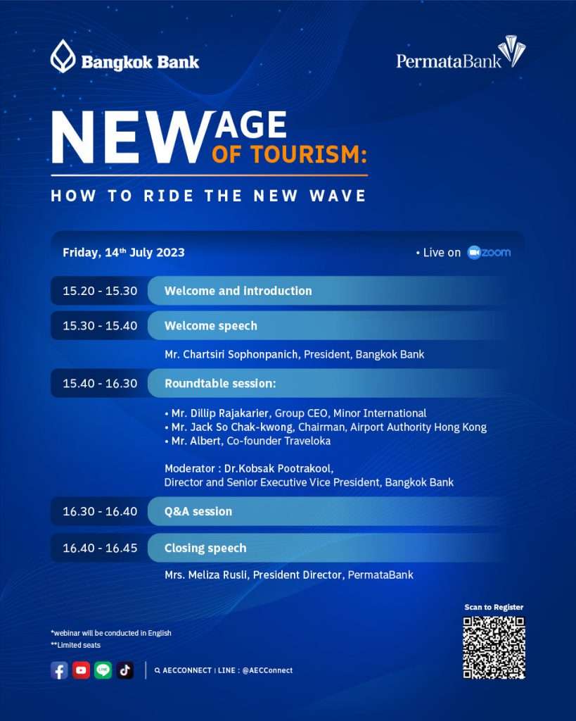 โอกาสนี้ ธนาคารกรุงเทพ และ ธนาคารเพอร์มาตา (Permata Bank) จึงได้ร่วมกันจัดสัมมนาออนไลน์ ในหัวข้อ “ยุคใหม่อุตสาหกรรมท่องเที่ยว: ปรับตัวอย่างไรให้ตรงใจนักเดินทาง” (The New Age of Tourism: How to Ride the New Wave) เพื่อเป็นเวทีสำหรับแบ่งปันมุมมอง ข้อคิดเห็น และข้อมูลเชิงลึกจากผู้บริหารธุรกิจและองค์กรชั้นนำในอุตสาหกรรมท่องเที่ยวของอาเซียน ซึ่งเชื่อมั่นว่าจะเป็นประโยชน์อย่างยิ่งแก่ธุรกิจต่างๆ ที่อยู่ในห่วงโซ่คุณค่าของธุรกิจท่องเที่ยว