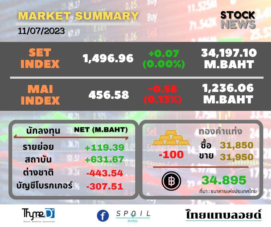 SET ปิดวันนี้ที่ 1,496.96 จุด เพิ่มขึ้น 0.07 จุด (+0.00%) มูลค่าซื้อขาย 34,188.57 ล้านบาท
