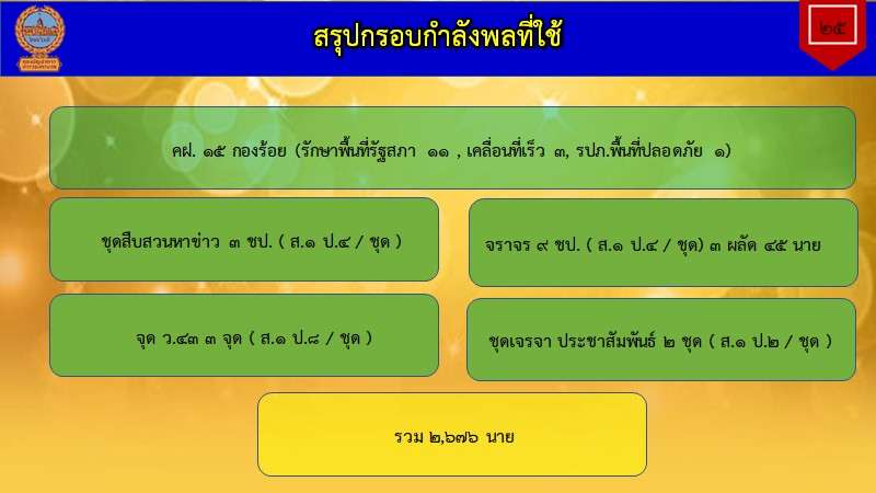 ทั้งนี้ มีรายงานว่ามีการเตรีมกำลังชุดควบคุมฝูงชนจำนวน 15 กองร้อย โดยวางกำลังรักษาพื้นที่รัฐสภา 11 กองร้อย ,เคลื่อนที่เร็ว 3 กองร้อย และ รปภ.พื้นที่ปลอดภัย 1 กองร้อย พร้อมจัดชุดสืบสวนหาข่าว ,จราจร,จุดตรวจสกัดและชุดเจรจาประชาสัมพันธ์ รวมกว่า 2,636 นาย ไว้ดูแลความเรียบร้อยการชุมนุม