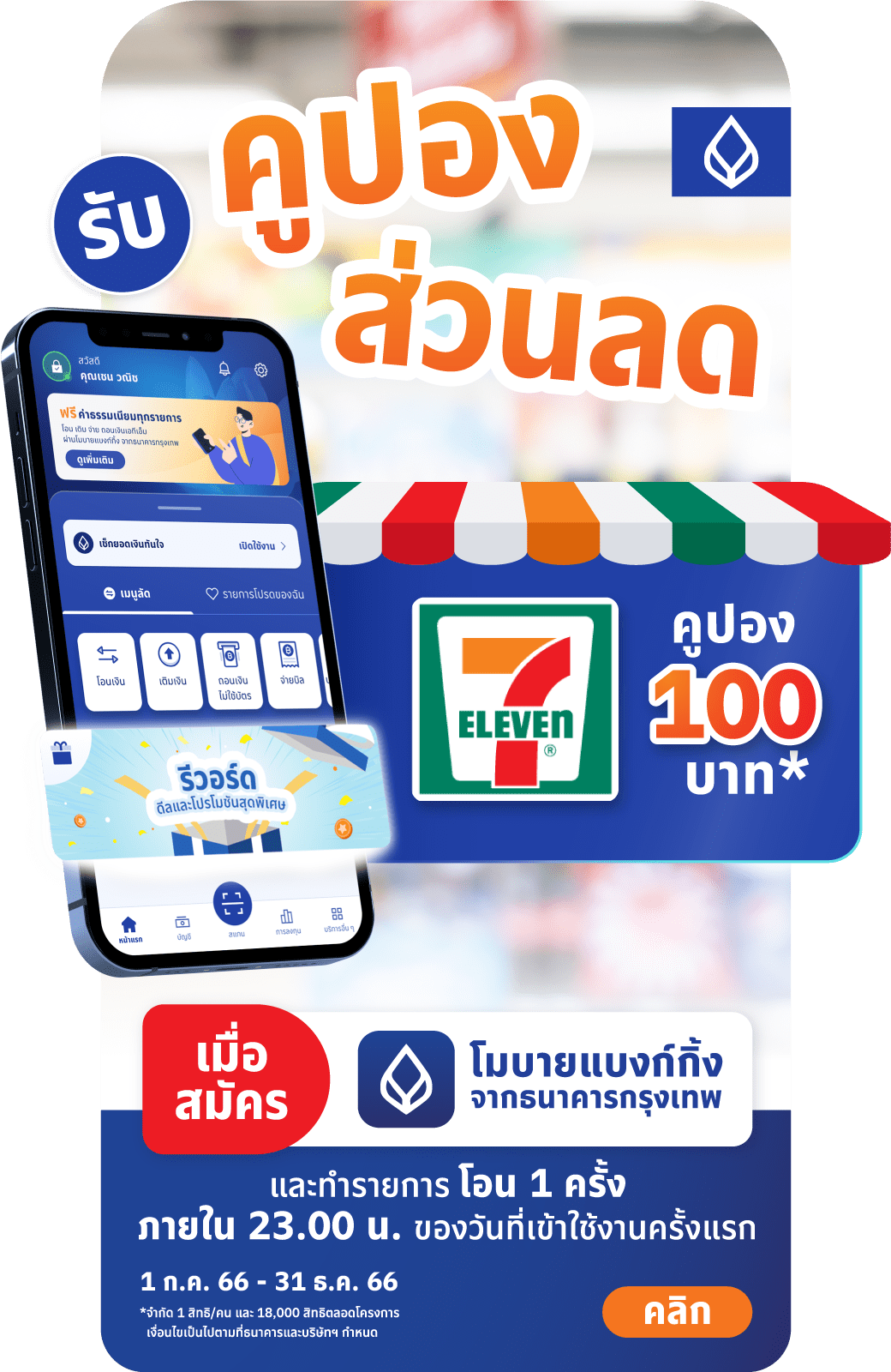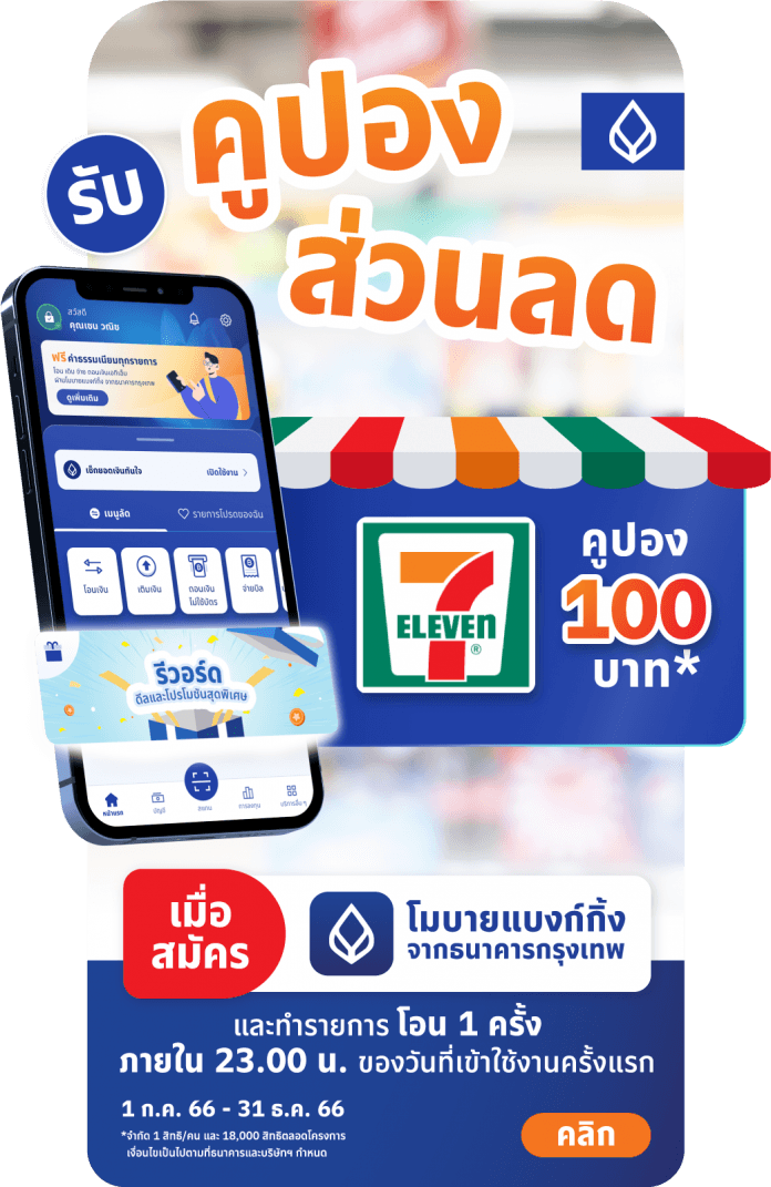 ที่กำหนด นอกจากนี้ ลูกค้าใหม่ที่เพิ่งสมัครบริการโมบายแบงก์กิ้ง และโอนเงินภายในเวลา 23.00 น. ของวันที่เข้าใช้งานครั้งแรก รับฟรี! คูปองส่วนลด 7-Eleven 100 บาท