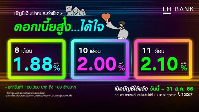 ธนาคารแลนด์ แอนด์ เฮ้าส์ จำกัด (มหาชน) (LH Bank) ออกผลิตภัณฑ์เงินฝากประจำพิเศษ ดอกเบี้ยสูงได้ใจ ตอบโจทย์ลูกค้าที่มองหาเงินฝากที่ให้ผลตอบแทนที่แน่นอนและคุ้มค่าในช่วงทิศทาง ดอกเบี้ยขาขึ้น ได้แก่ เงินฝากประจำพิเศษ 8 เดือน ดอกเบี้ย 1.88%, 10 เดือน ดอกเบี้ย 2.00% และ 11 เดือน ดอกเบี้ย 2.10% เปิดบัญชีขั้นต่ำ 100,000 บาท และการฝากเพิ่มแต่ละครั้งขั้นต่ำ 100,000 บาท ขึ้นไป และยอดเงินฝากรวมทั้งบัญชีเดี่ยว และ/หรือ บัญชีร่วมต้องมียอดรวมกันไม่เกิน 100 ล้านบาท ต่อรายลูกค้า (ทุกสาขา/ทุกช่องทางรวมกัน) พร้อมรับดอกเบี้ยเมื่อครบกำหนด ถือเป็นแคมเปญเงินฝากสุดพิเศษสำหรับลูกค้าบุคคลธรรมดาได้มีทางเลือกในการออมเงินที่ให้ผลตอบแทนดีขึ้นลูกค้าที่สนใจสามารถเปิดบัญชีเงินฝากประจำพิเศษ 8 เดือน 10 เดือน และ 11 เดือน ได้ตั้งแต่วันนี้ ถึง 31 สิงหาคม 2566 เปิดบัญชีได้สะดวกและปลอดภัย ผ่านแอปพลิเคชัน LHB You ศึกษารายละเอียดผลิตภัณฑ์ที่ www.lhbank.co.th หรือสอบถามรายละเอียดเพิ่มเติมได้ ที่ LH Bank