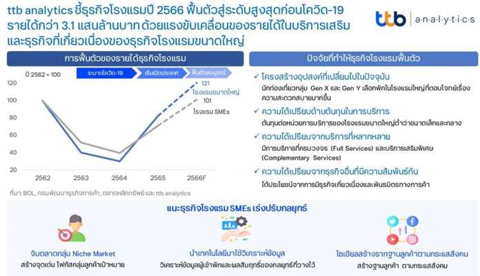 ศูนย์วิเคราะห์เศรษฐกิจทีทีบี หรือ ttb analytics คาดปี 2566 กลุ่มธุรกิจโรงแรมฟื้นตัวสมบูรณ์ผ่านจุดสูงสุดเดิม ด้วยมูลค่ามากกว่า 3.1 แสนล้านบาท ด้วยแรงหนุนของการขยายตัวในส่วนของรายได้ด้านบริการเสริมและการเพิ่มช่องทางรายได้ในธุรกิจใหม่ของกลุ่มโรงแรมขนาดใหญ่ ส่งผลให้มีความได้เปรียบเชิงต้นทุนในหลากหลายมิติ พร้อมแนะโรงแรมขนาดเล็กและกลางเตรียมปรับกลยุทธ์เน้นตลาด Niche Market ที่มีการแข่งขันด้านต้นทุนที่