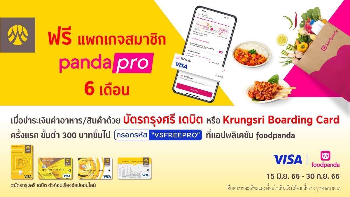 กรุงศรี (ธนาคารกรุงศรีอยุธยา จำกัด (มหาชน)) เอาใจสายฟู้ดเดลิเวอรี่ มอบสิทธิพิเศษสำหรับผู้ถือบัตรกรุงศรี เดบิต ทุกประเภท และ Krungsri Boarding Card เมื่อผูกบัตรและชำระเงินด้วยบัตรกรุงศรี เดบิต หรือ Krungsri Boarding Card ครั้งแรกในการสั่งอาหารหรือสินค้าขั้นต่ำ 300 บาทขึ้นไป ผ่านแอปพลิเคชัน foodpanda พร้อมกรอกรหัส VSFREEPRO รับฟรี แพกเกจสมาชิก pandapro 6 เดือน มูลค่า 150 บาท ตั้งแต่วันที่ 15 มิ.ย. 66 – 30
