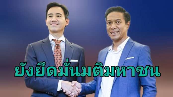 ผมได้รับโทรศัพท์จาก นพ.ชลน่าน ศรีแก้ว หัวหน้าพรรคเพื่อไทย นายภูมิธรรม เวชยชัย รองหัวหน้าพรรคเพื่อไทย และนายประเสริฐ จันทรรวงทอง เลขาธิการพรรคเพื่อไทย แจ้งผลการประชุมระหว่างพรรคเพื่อไทยและพรรคก้าวไกลแล้วครับ สรุปว่า พรรคเพื่อไทย ไม่สามารถรวบรวมเสียง สส.และ สว. ได้เพิ่มมากขึ้น ถ้ายังมีพรรคก้าวไกลอยู่ และพรรคก้าวไกลไม่สามารถลดเพดานในการแก้ไขมาตรา 112 ได้ และต้องให้แต่ละพรรคใช้ดุลยพินิจในการเลือกนายกรัฐมนตรีที่จะเสนอแคนดิเดตนายกรัฐมนตรี พรรคเพื่อไทย ทำให้ 8 พรรคร่วมจะไม่มีการพูดคุยกันแล้ว