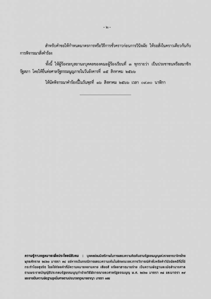 ทั้งนี้ ให้ผู้ร้องระบุสถานะบุคคลของคณะผู้ร้องเรียนที่ 3 ทุกรายว่า เป็นประชาชนหรือสมาชิกรัฐสภา โดยให้ยื่นต่อศาลรัฐธรรมนูญภายในวันอังคารที่ 15 สิงหาคม 2566 ให้นัดพิจารณาคำร้องนี้ในวันพุธที่ 16 สิงหาคม 2566 เวลา 9.30 นาฬิกา