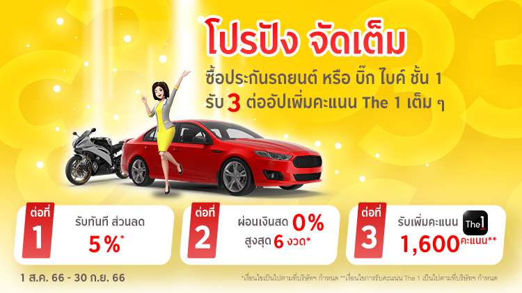 • ต่อที่ 3 รับ: รับเพิ่มคะแนน The 1 จำนวน 1,600 คะแนน สำหรับค่าเบี้ยประกันภัยสุทธิตั้งแต่ 10,000 บาทขึ้นไป โดยจะดำเนินการเพิ่มคะแนนสะสมเข้าบัญชี The 1 ที่ผูกไว้กับหมายเลขบัตรประชาชน ภายใน 45 วันทำการ