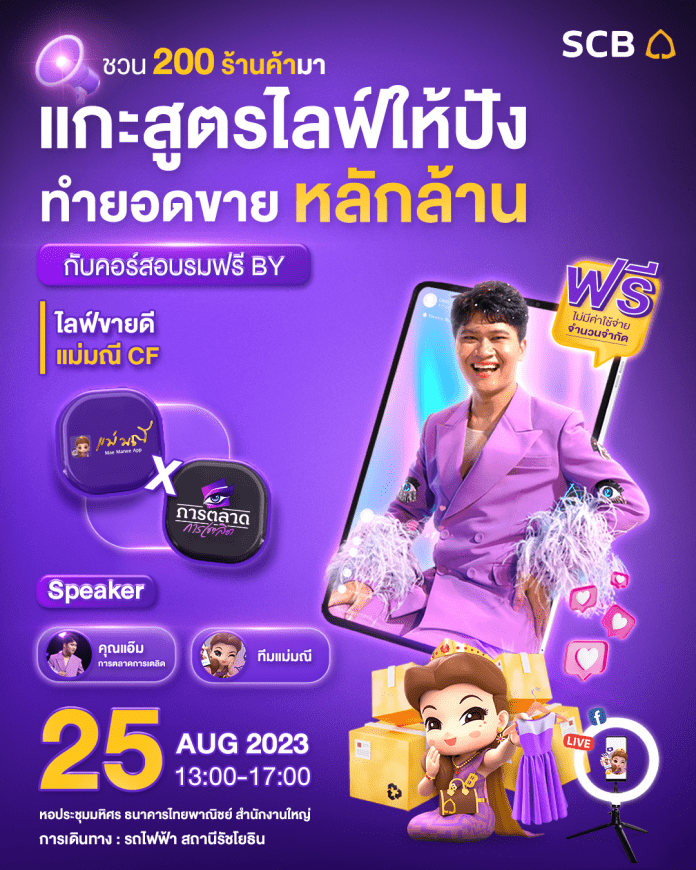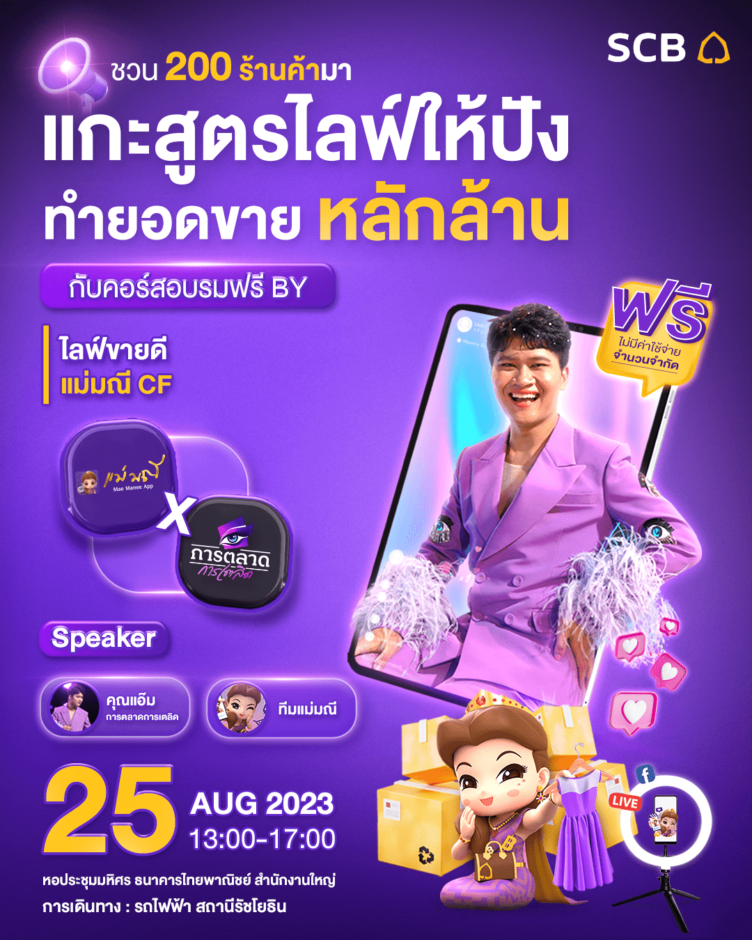 ธนาคารไทยพาณิชย์ มุ่งมั่นเคียงข้างผู้ประกอบการรายย่อย (SSME) เดินหน้าผนึกกำลังพันธมิตรที่แข็งแกร่งในหลากหลาย ecosystem อย่างต่อเนื่อง เพื่อช่วยสนับสนุนและส่งเสริมให้การทำธุรกิจในยุคดิจิทัลของพ่อค้าแม่ค้าประสบความสำเร็จ ล่าสุด แท็กทีม การตลาดการเตลิด เปิดเวทีประกวด Live on stage สำหรับร้านค้าออนไลน์ที่ไลฟ์สดขายของเพื่อเฟ้นหาสุดยอดนักไลฟ์ โดยจะทำการคัดเลือกร้านค้าในรอบแรกจำนวน 200 ร้าน เพื่อเข้าร่วมอบรมคอร์สพิเศษ “แกะสูตรไลฟ์ให้ปัง ทำยอดขายหลักล้าน” เรียนรู้เทคนิคการไลฟ์เพื่อสร้างยอดขายให้ปังอย่างใกล้ชิดกับกูรูแถวหน้า นำโดย ครูแอ๊ม-การตลาดการเตลิด ที่มียอดขายหลักล้านบนแพลตฟอร์ม Tik Tok และทีมผู้เชี่ยวชาญจากแม่มณี ก่อนทำการคัดให้เหลือเพียง 40 ร้าน เพื่อร่วมกิจกรรม “แม่มณี ชวนแม่ค้ามือฉมัง มาขายปังบน Tik Tok” แข่งขันจัดทำวิดีโอขายของ เพื่อค้นหา 20 ร้านค้าออนไลน์ที่จะได้เข้าสู่การแข่งขันรอบสุดท้าย “Live on stage” เฟ้นหาผู้ชนะสุดยอด “ไลฟ์ขายดี แม่มณี CF” ต่อไป