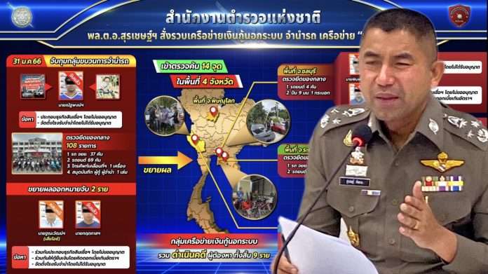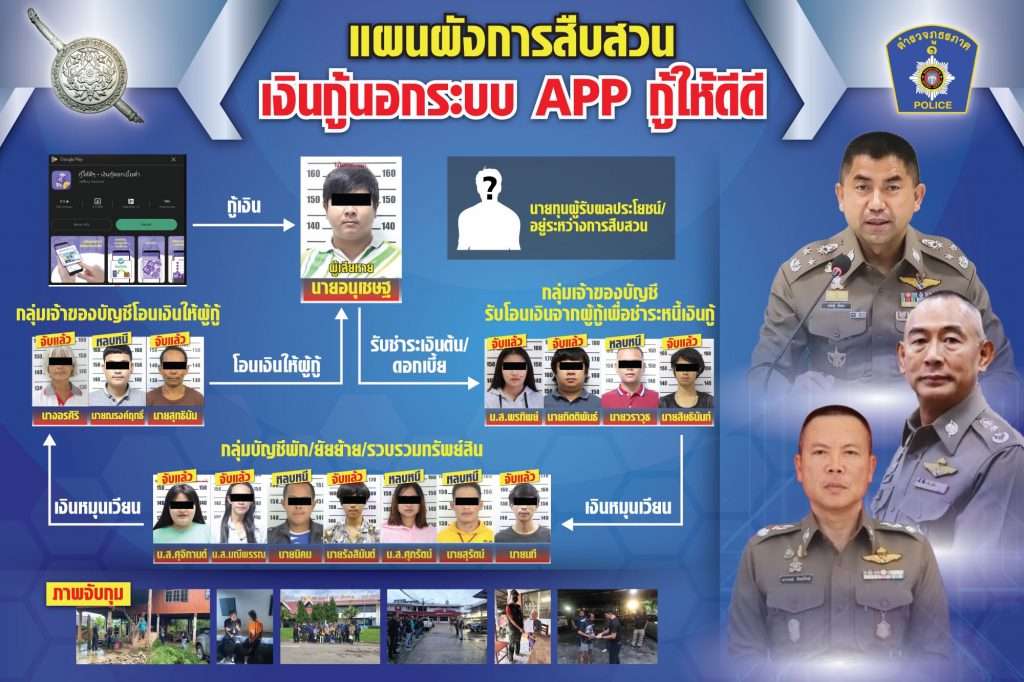 รองฯโจ๊ก สั่ง ศปน.ตร. ระดมกวาดล้างเครือข่ายแอปเงินกู้นอกระบบและแก๊งรับจำนำรถในพื้นที่ภาค 1 และ 2 ปูพรมตรวจค้นพื้นที่ รวมดำเนินคดี ผู้ต้องหา 23 ราย ยึดของกลางอีกหลายรายการ