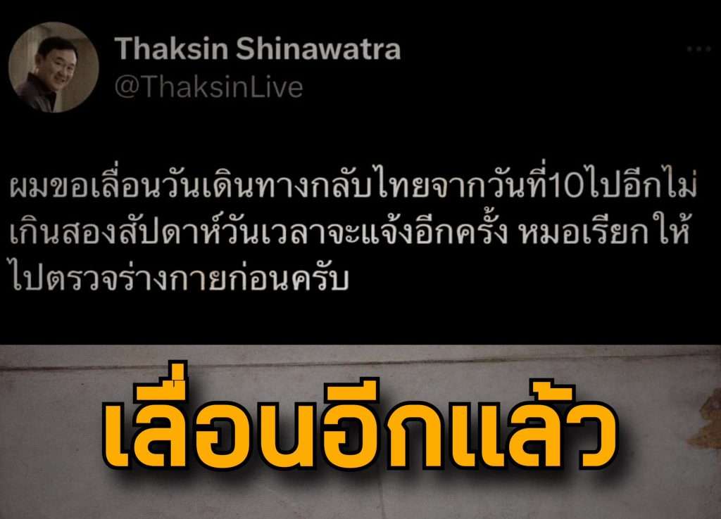 ทุกอย่างเลื่อน ทั้งศาลรัฐธรรมนูญ เพื่อไทยประกาศข้ามขั้ว โหวตนายกฯ การเลื่อนกลับไทยของทักษิณจึงเชื่อมกันหมด อย่าไปให้คนไทยรอเก้อ คงมีจตุพรกับชูวิทย์ 2 คนเท่านั้นที่รู้ว่าท่านไม่กลับ คนที่เคยติดคุกจะรู้ว่าการก้าวเท้าเข้าคุกล้วนอยู่ที่ใจ การกลับหรือไม่กลับจึงอยู่ที่ใจ ไม่ใช่ไฟยังไม่เขียว ครั้งหน้าไม่ต้องบอกล่วงหน้าดีกว่า จะกลับก็กลับเลย