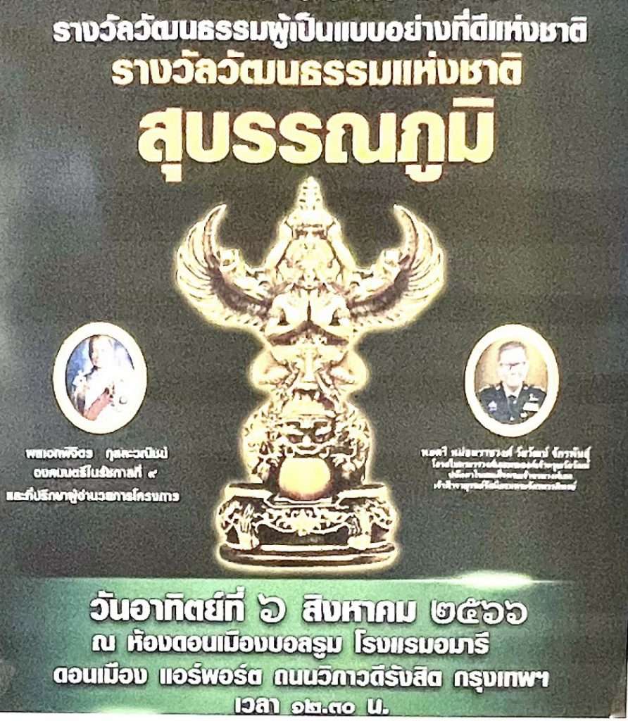 ดอนเมือง แอร์พอร์ต ถนนวิภาวดีรังสิต กรุงเทพฯ สหเครือข่ายวัฒนธรมแห่งชาติ(National Culture of United Networks)โดยมี พล.อ.พิจิตร กุลละวณิชย์ องคมนตรี ในรัชกาลที่ 9 เป็นผู้ก่อตั้ง คณะกรรมการฯ ได้คัดเลือก บุคคลเข้ารับ”รางวัลวัฒนธรรมผู้เป็นแบบอย่างที่ดีแห่งชาติ รางวัลสุบรรณภูมิ ประจำปี 2566 โดยมี”พลตรี หม่อมราชวงศ์ วัยวัฒน์ จักรพันธ์ุ”เป็นประธานฯมอบรางวัล ให้แก่ ผู้ที่ได้รางวัล”สหเครือข่ายวัฒนธรมแห่งชาติ(National Culture of United Networks) ประจำปีนี้ ผู้ที่ได้รางวัลวัฒนธรรมผู้เป็นแบบอย่างที่ดีแห่งชาติ ประเภทบุคคลตัวอย่างแห่งชาติ คือ ศ.ดร. ยงสยาม สนามพล