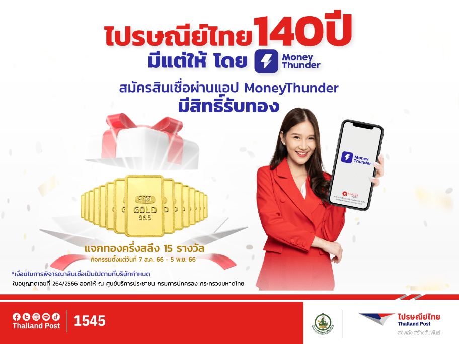 ผู้ที่สนใจสมัครสินเชื่อและรับสิทธิ์เข้าร่วมกิจกรรมแจกทองในแคมเปญ สามารถดาวน์โหลดแอปพลิเคชัน MoneyThunder จากช่องทางเฟซบุ๊กหรือเว็บไซต์ของไปรษณีย์ไทย (www.thailandpost.co.th) และสมัครสินเชื่อตามเงื่อนไขที่บริษัทกำหนดไว้ ระหว่างวันที่ 7 สิงหาคม ถึง 5 พฤศจิกายน 2566 เท่านั้น โดยสามารถอ่านรายละเอียดเงื่อนไขแคมเปญได้จาก www.money-thunder.com หรือสอบถามรายละเอียดเพิ่มเติมที่ LINE: @MoneyThunder