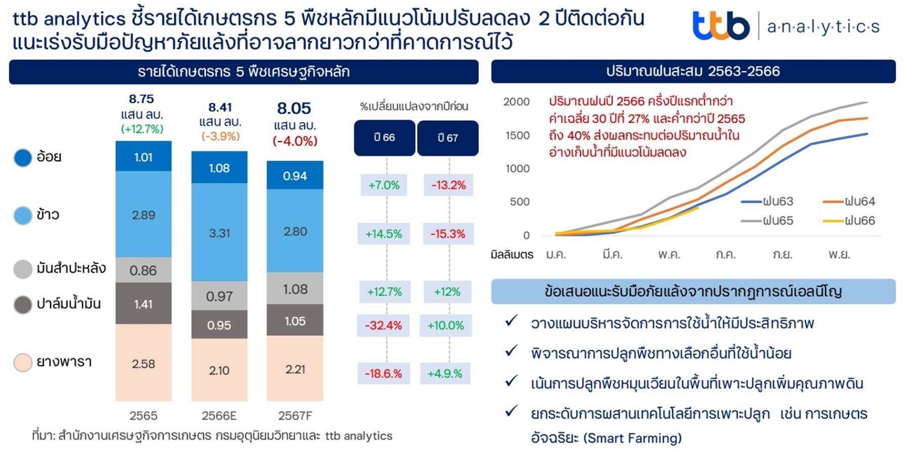 ศูนย์วิเคราะห์เศรษฐกิจ ทีทีบี หรือ ttb analytics คาดปี 2567 รายได้เกษตรกร 5 พืชหลักลดลงราว 4.0% จากแรงกดดันของปรากฏการณ์เอลนีโญ ซึ่งเป็นการหดตัวติดต่อกัน 2 ปี จากปริมาณฝนที่น้อยลงกระทบต่อผลผลิตเกษตรตั้งแต่ปี 2567 แนะเกษตรกรเร่งปรับตัวรับมือกรณีภัยแล้งที่อาจยาวนานกว่าที่คาดและส่งผลกระทบต่อเนื่องไปยังปี 2568