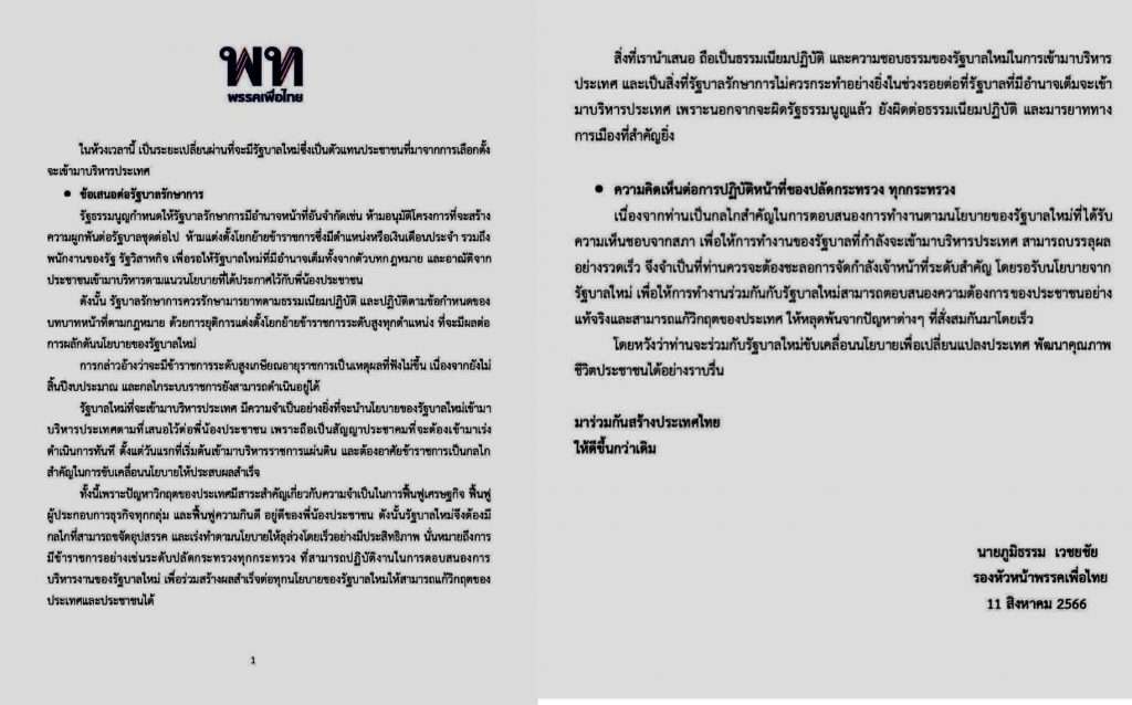 เมื่อวันที่11 สิงหาคม 2566 ผู้สื่อข่าวไทยแทบลอยด์รายงานว่า พรรคเพื่อไทย ได้ออกแถลงการณ์ มีใจความระบุว่า