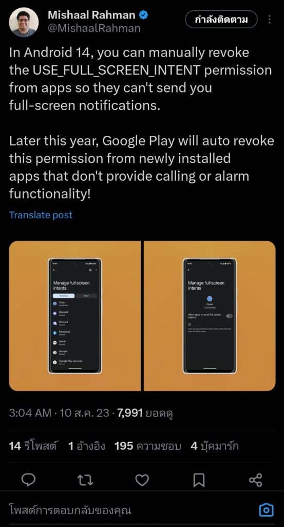 โดยได้อธิบายว่า Interface ของ Android 14 นั้น จะจำกัดสิทธิการอนุญาตแสดงแจ้งเตือนแบบเต็มหน้าจอ หรือตัวโค้ดคำสั่ง USE_FULL_SCREEN_INTENT ในแต่ละแอป ซึ่งจะทำให้แอปไม่สามารถแจ้งเตือนเต็มหน้าจอ รวมถึงแสดงโฆษณาเต็มหน้าจอได้