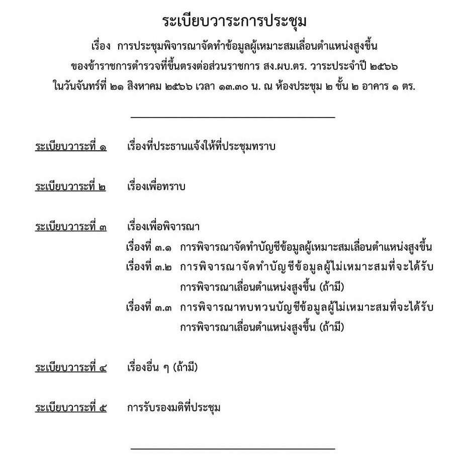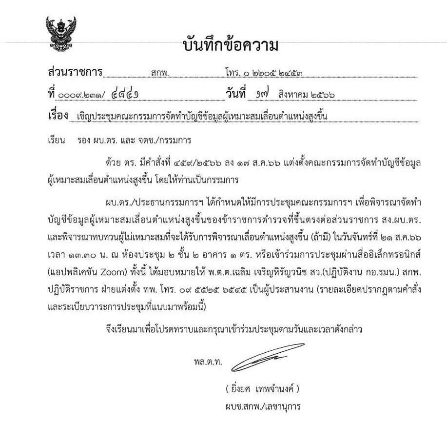 ด้วย ตร. มีคำสั่งที่ 459/2566 ลง 17 ส.ค.66 แต่งตั้งคณะกรรมการจัดทำบัญชีข้อมูล ผู้เหมาะสมเลื่อนตำแหน่งสูงขึ้น โดยให้ท่านเป็นกรรมการ ผบ.ตร./ประธานกรรมการฯ ได้กำหนดให้มีการประชุมคณะกรรมการฯ เพื่อพิจารณาจัดทำ บัญชีข้อมูลผู้เหมาะสมเลื่อนตำแหน่งสูงขึ้นของข้าราชการตำรวจที่ขึ้นตรงต่อส่วนราชการ สง.ผบ.ตร. และพิจารณาทบทวนผู้ไม่เหมาะสมที่จะได้รับการพิจารณาเลื่อนตำแหน่งสูงขึ้น (ถ้ามี) ในวันจันทร์ที่ 21 ส.ค.66 เวลา 13.30 น. ณ ห้องประชุม 2 ชั้น 2 อาคาร 1 ตร. หรือเข้าร่วมการประชุมผ่านสื่ออิเล็กทรอนิกส์ (แอปพลิเคชัน Zoom)