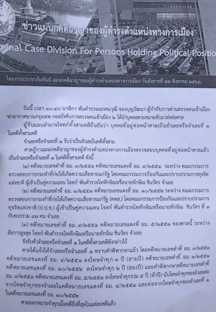 วันที่ 22 ส.ค.66 ผู้สื่อข่าวรายงานว่า ฝ่ายงานประชาสัมพันธ์ แผนกคดีอาญาของผู้ดำรงตำแหน่งทางการเมือง วันอังคารที่ 22 สิงหาคม 2566 วันนี้ เวลา 10.40 น. พ.ต.อ.คมวุฒิ จองบุญวัฒนา ผู้กำกับการด่านตรวจคนเข้าเมือง ท่าอากาศยานกรุงเทพ กองบังคับการตรวจคนเข้าเมือง 2 ได้นำบุคคลตามหมายจับมาส่งต่อศาล ผู้รับมอบอำนาจโจทก์ทั้งสามคดียืนยันว่า บุคคลที่ อยู่ต่อหน้าศาลเป็นจำเลยหรือจำเลยที่ 1 ในคดีทั้งสามคดี จำเลยหรือจำเลยที่ รับว่าเป็นจำเลยในคดีทั้งสาม