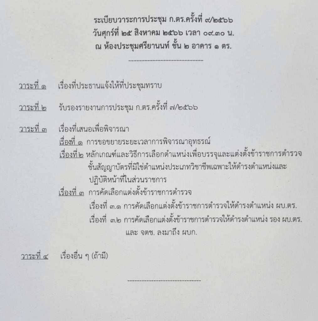และ ในวันศุกร์ที่ 25 สิงหาคม 2566 เวลา 09.30 น. พล.อ.ประยุทธ์ จันทร์โอชา นายกรัฐมนตรี และรัฐมนตรีว่าการกลาโหม ในฐานะประธานคณะกรรรมการข้าราชการตำรวจ(ก.ตร.) จะเดินทางมาเป็นประธานฯประชุม ก.ตร.ครั้งที่ 9/2566 โดยมีวาระการประชุม 4 วาระ ประกอบด้วย วาระที่ 1เรื่องที่ประธานแจ้งให้ที่ประชุมทราบ ,วาระที่ 2 รับรองรายงานการประชุม ก.ตร.ครั้งที่ 7/2566 ,วาระที่ 3 เรื่องที่เสนอเพื่อพิจารณา ประกอบด้วย 3 เรื่อง คือ เรื่องที่ 1 การขยายระยะเวลาการพิจารณาอุทธรณ์ ,เรื่องที่ 2 หลักเกณฑ์และวิธีเลือกตำแหน่งเพื่อบรรจุและแต่งตั้งข้าราชการตำรวจชั้นสัญญาบัตรที่มิใช่ตำแหน่งประเภทวิชาชีพเฉพาะให้ดำรงตำแหน่งและปฎิบัติหน้าที่ในส่วนราชการ และเรื่องที่3 การคัดเลือกแต่งตั้งข้าราชการตำรวจ ประกอบด้วย เรื่องที่ 3.1 การคัดเลือกตั้งข้าราชการตำรวจให้ดำรงตำแหน่ง ผู้บัญชาการตำรวจแห่งขาติ (ผบ.ตร.) คนที่ 14 และเรื่องที่ 3.2 การคัดเลือกแต่งตั้งข้าราชการตำรวจให้ดำรงตำแหน่ง รองผบ.ตร.และ จตช.ลงมาถึง ผบก. และวาระที่ 4 เรื่องอื่นๆ