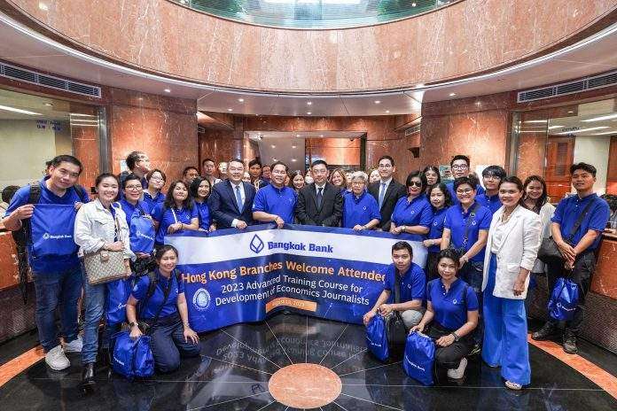 นายกฤษณะพงศ์ พงศ์แสนยากร นายกสมาคมฯ พร้อมคณะกรรมการ และคณะสื่อมวลชน ผู้เข้าอบรม ‘โครงการพัฒนาศักยภาพผู้สื่อข่าวเศรษฐกิจระดับสูง (พศส.)’ ประจำปี 2566 ซึ่งจัดขึ้นในหัวข้อ “เปิดโลกนวัตกรรม ก้าวทันเทรนด์การเงินยั่งยืน” ในโอกาสเดินทางศึกษาดูงาน ณ เขตบริหารพิเศษฮ่องกงแห่งสาธารณรัฐประชาชนจีน และเข้าเยี่ยมชมพร้อมร่วมรับฟังการอัปเดตสถานการณ์เศรษฐกิจ ภาพรวมการดำเนินธุรกิจธนาคารกรุงเทพ สาขาฮ่องกง รวมถึงมุมมองโอกาสการค้าการลงทุนจากธนาคาร ในฐานะ ‘ธนาคารชั้นนำระดับภูมิภาค’ ซึ่งมีประสบการณ์ดำเนินงานเกือบ 70 ปีในฮ่องกง และเป็นธนาคารไทยเพียงแห่งเดียว ที่ได้รับใบอนุญาตประกอบธุรกิจด้านการธนาคารอย่างเต็มรูปแบบ หรือ Full License ในฮ่องกง ปัจจุบันเปิดให้บริการ จำนวน 2 สาขา ได้แก่ สาขาฮ่องกง และสาขาเกาลูน พร้อมมีเครือข่ายสาขาครอบคลุมภูมิภาคอย่างแข็งแกร่ง พร้อมบริการลูกค้าอย่างครบวงจรด้วยความเข้าใจ และเป็น “เพื่อนคู่คิด” เติบโตอย่างมั่นคงไปพร้อมกับลูกค้า