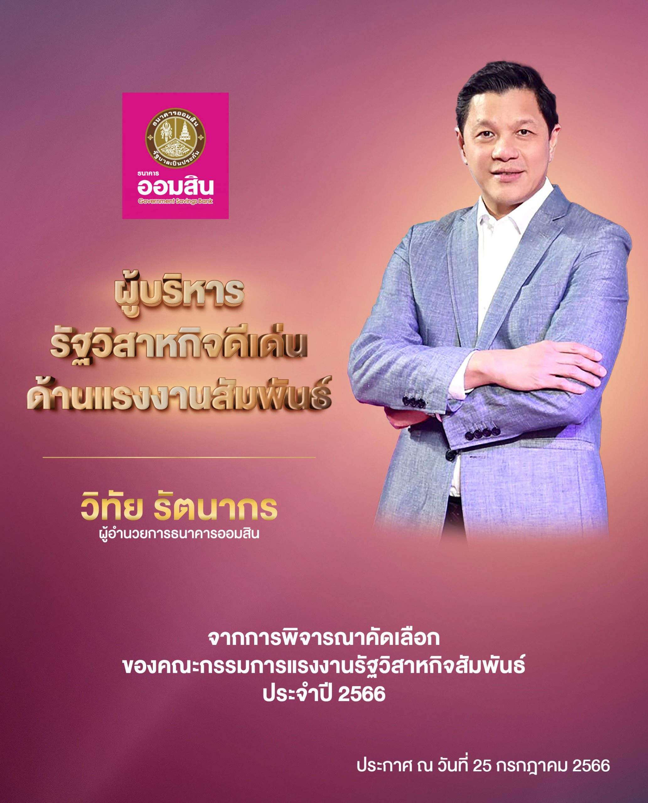 นายวิทัย รัตนากร ผู้อำนวยการธนาคารออมสิน รับรางวัลผู้บริหารรัฐวิสาหกิจดีเด่นด้านแรงงานสัมพันธ์ และรางวัลรัฐวิสาหกิจดีเด่นด้านแรงงานสัมพันธ์ ประจำปี 2566 จากการพิจารณาและคัดเลือกของคณะกรรมการแรงงานรัฐวิสาหกิจสัมพันธ์ กรมสวัสดิการและคุ้มครองแรงงาน กระทรวงแรงงาน เนื่องด้วยธนาคารให้ความสำคัญในการบริหารจัดการแรงงานสัมพันธ์อย่างต่อเนื่อง ผ่านกระบวนการร่วมคิดร่วมทำร่วมกันปรับปรุงประสิทธิภาพการดำเนินงานของธนาคาร ตลอดจนส่งเสริมและยกระดับคุณภาพชีวิตความเป็นอยู่ของพนักงานและลูกจ้างให้ดียิ่งขึ้น ควบคู่กับการสร้างความสัมพันธ์อันดีระหว่างกัน ผ่านกิจกรรมต่างๆ อาทิ การฝึกอบรมพัฒนาให้ความรู้ การให้ความช่วยเหลือบรรเทาความเดือดร้อนในช่วงวิกฤตโควิด-19 การปรับปรุงสวัสดิการและสิทธิประโยชน์ที่จำเป็นให้สอดคล้องกับสภาพเศรษฐกิจปัจจุบัน การลงพื้นที่ตรวจเยี่ยมให้กำลังใจเจ้าหน้าที่ประจำสาขาทั่วประเทศ รวมทั้งเปิดช่องทางใหม่ในการรับแจ้งปัญหาผ่านทางไลน์เพื่อรับฟังปัญหาและข้อเสนอแนะของลูกจ้างและพนักงาน ซึ่งสามารถช่วยแก้ไขปัญหาได้อย่างตรงจุด รวดเร็ว เป็นต้น