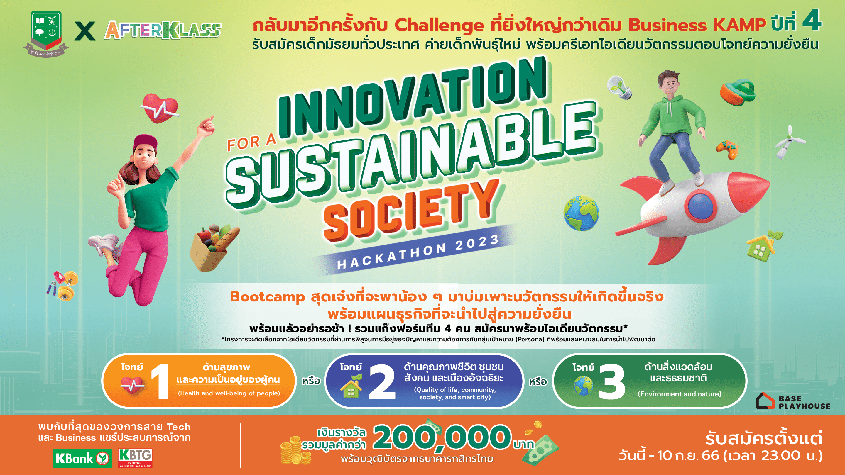 สำหรับ AFTERKLASS Business KAMP ปีที่ 4 แคมป์แข่งขันสร้างไอเดียธุรกิจและนวัตกรรมสตาร์ทอัพในรูปแบบแฮคกาธอน (Hackathon) ในปีนี้ จัดขึ้นในธีม “Innovation for a Sustainable Society Hackathon 2023” มุ่งไปที่การสร้างแผนธุรกิจด้วยโปรแกรมบ่มเพาะนวัตกรรม (Incubation Program) ที่ไม่เพียงนำเสนอแนวคิดอย่างสร้างสรรค์เท่านั้น ยังช่วยผลักดันให้นำไปพัฒนาต่อให้เกิดขึ้นจริง สร้างผลกระทบเชิงบวกต่อสังคมที่มีประสิทธิภาพและยั่งยืนได้