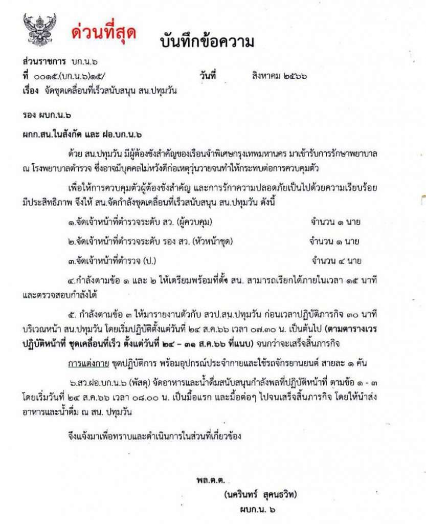 วันที่ 24 ส.ค.66 พล.ต.ต. นครินทร์ สุคนธวิท ผบก.น.6 มีบันทึกข้อความด่วนที่สุด บันทึกข้อความ ส่วนราชการ เรื่อง จัดชุดเคลื่อนที่เร็วสนับสนุน สน.ปทุมวัน สั่งการถึง รอง ผบก.น.6, ผกก.สน.ในสังกัด และ ฝอ.บก.น.6 ระบุ
