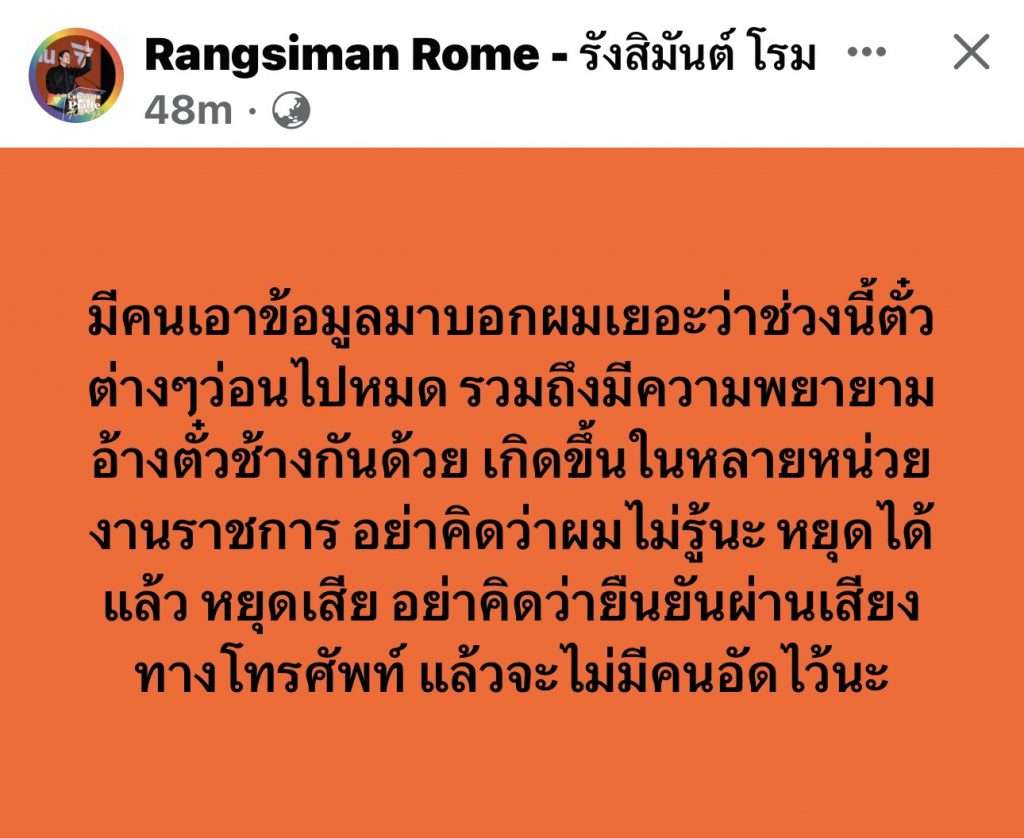 ด้าน นาย รังสิมันต์ โรม สส.จากพรรคก้าวไกลและโฆษกพรรคฯ ไพสต์ข้อความผ่านเฟสบุคมีใจความระบุว่า “มีคนเอาข้อมูลมาบอกผมเยอะว่าช่วงนี้ตั๋วต่างๆว่อนไปหมด รวมถึงมีความพยายามอ้างตั๋วช้างกันด้วย เกิดขึ้นในหลายหน่วยงานราชการ อย่าคิดว่าผมไม่รู้นะ หยุดได้แล้ว หยุดเสีย อย่าคิดว่ายืนยันผ่านเสียง ทางโทรศัพท์ แล้วจะไม่มีคนอัดไว้นะ” ข้อความFBดังกล่าวระบุ