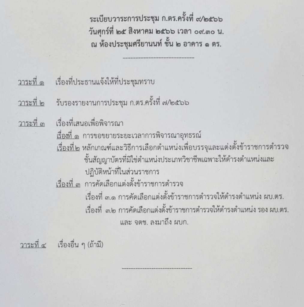 สำหรับวาระการแต่งตั้งในวันศุกร์ที่ 25 สิงหาคม 2566 เวลา 09.30 น. พล.อ.ประยุทธ์ จันทร์โอชา นายกรัฐมนตรี และรัฐมนตรีว่าการกลาโหม ในฐานะประธานคณะกรรรมการข้าราชการตำรวจ(ก.ตร.) จะเดินทางมาเป็นประธานฯประชุม ก.ตร.ครั้งที่ 9/2566 โดยมีวาระการประชุม 4 วาระ ประกอบด้วย วาระที่ 1เรื่องที่ประธานแจ้งให้ที่ประชุมทราบ ,วาระที่ 2 รับรองรายงานการประชุม ก.ตร.ครั้งที่ 7/2566 ,วาระที่ 3 เรื่องที่เสนอเพื่อพิจารณา ประกอบด้วย 3 เรื่อง คือ เรื่องที่ 1 การขยายระยะเวลาการพิจารณาอุทธรณ์ ,เรื่องที่ 2 หลักเกณฑ์และวิธีเลือกตำแหน่งเพื่อบรรจุและแต่งตั้งข้าราชการตำรวจชั้นสัญญาบัตรที่มิใช่ตำแหน่งประเภทวิชาชีพเฉพาะให้ดำรงตำแหน่งและปฎิบัติหน้าที่ในส่วนราชการ และเรื่องที่3 การคัดเลือกแต่งตั้งข้าราชการตำรวจ ประกอบด้วย เรื่องที่ 3.1 การคัดเลือกตั้งข้าราชการตำรวจให้ดำรงตำแหน่ง ผู้บัญชาการตำรวจแห่งขาติ (ผบ.ตร.) คนที่ 14 และเรื่องที่ 3.2 การคัดเลือกแต่งตั้งข้าราชการตำรวจให้ดำรงตำแหน่ง รองผบ.ตร.และ จตช.ลงมาถึง ผบก. และวาระที่ 4 เรื่องอื่นๆ